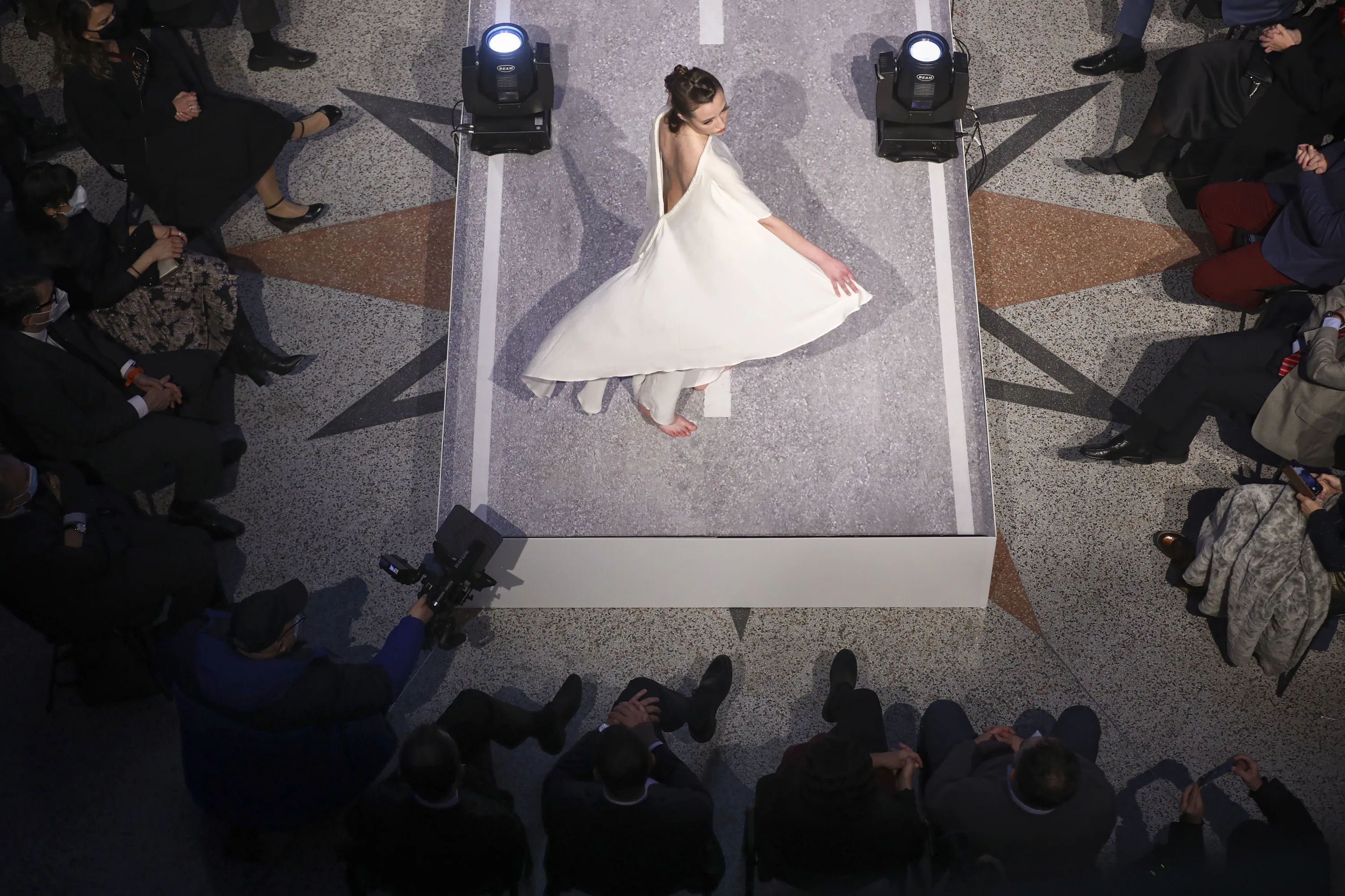 A model takes to the catwalk inside the 19th century building City Hall in Sarajevo, Bosnia, Thursday, December 16, 2021, during the presentation of a collection dubbed “No Nation Fashion”, a migrant-made fashion brand project. (Photo by AP Photo/Stringer)