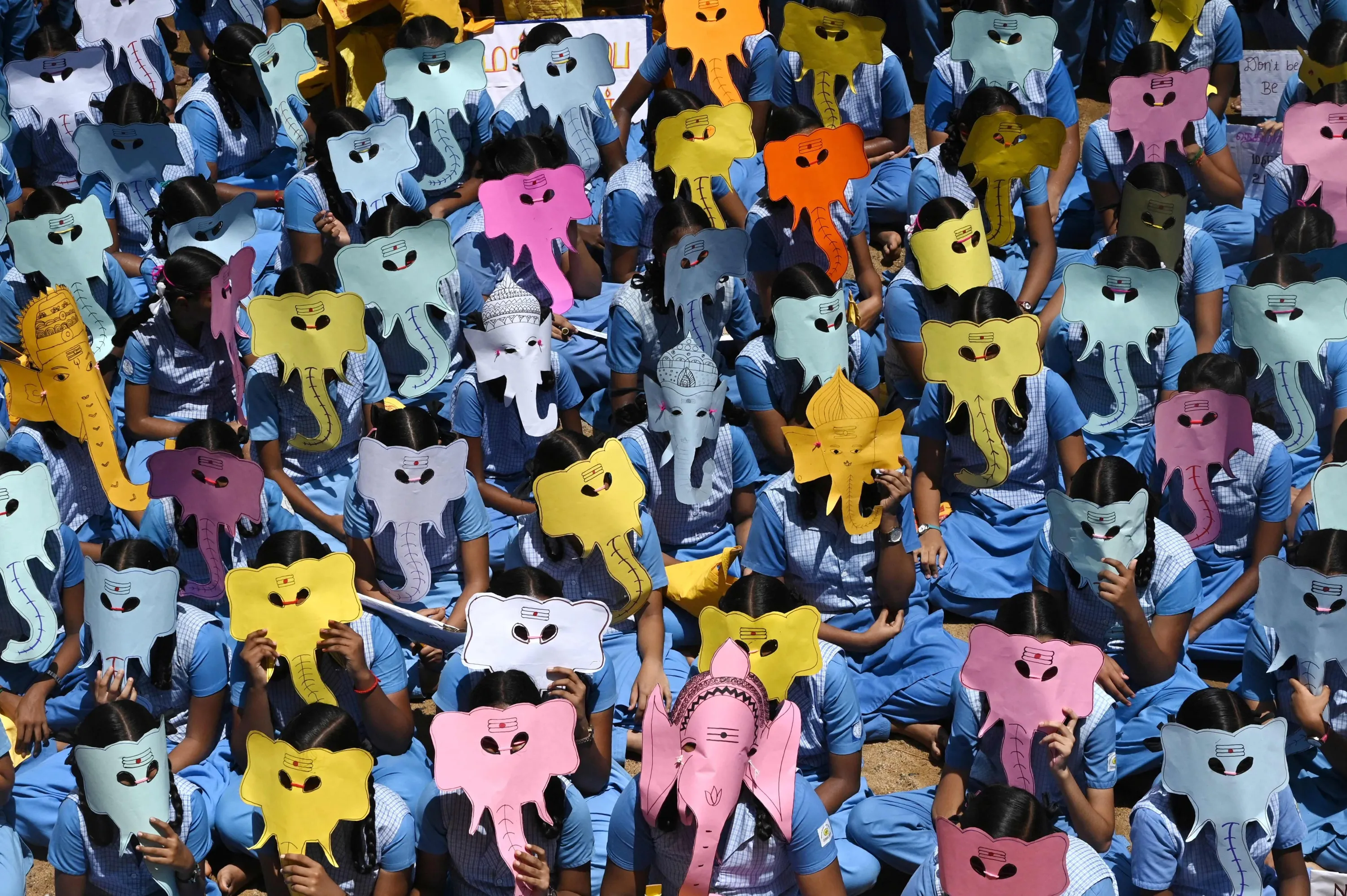 Children wearing masks of the elephant-headed Hindu God Lord Ganesha take part in an awareness campaign against the use of plastic ahead of the “Ganesh Chaturthi” festival, at a school in Chennai on August 30, 2022. (Photo by Arun Sankar/AFP Photo)