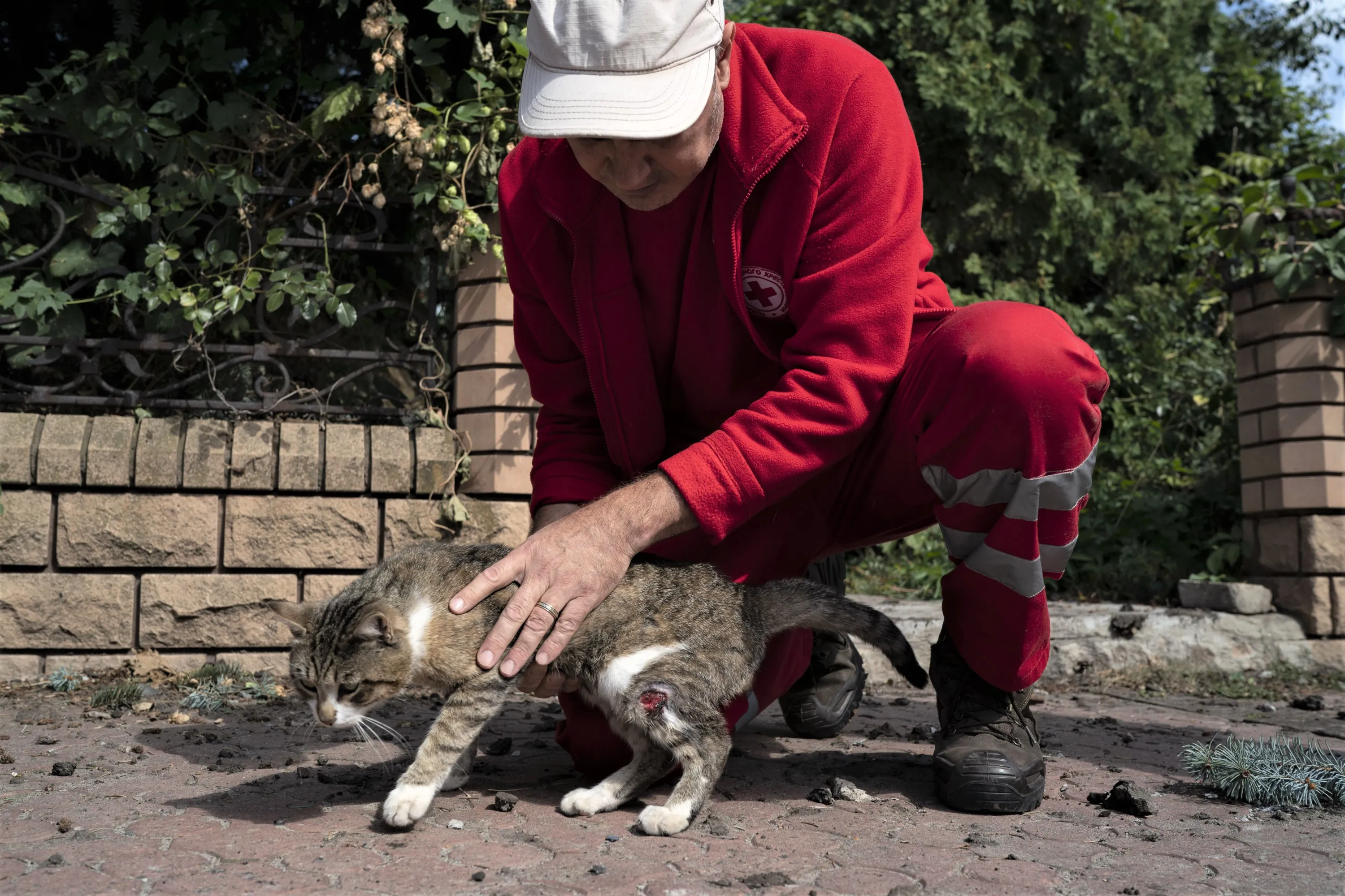A Ukrainian Red Cross Society volunteer pets a cat named Maks, that was slightly injured during a Russian attack last week that damaged the building of the humanitarian association in Sloviansk, Ukraine, Monday, September 5, 2022. (Photo by Leo Correa/AP Photo)