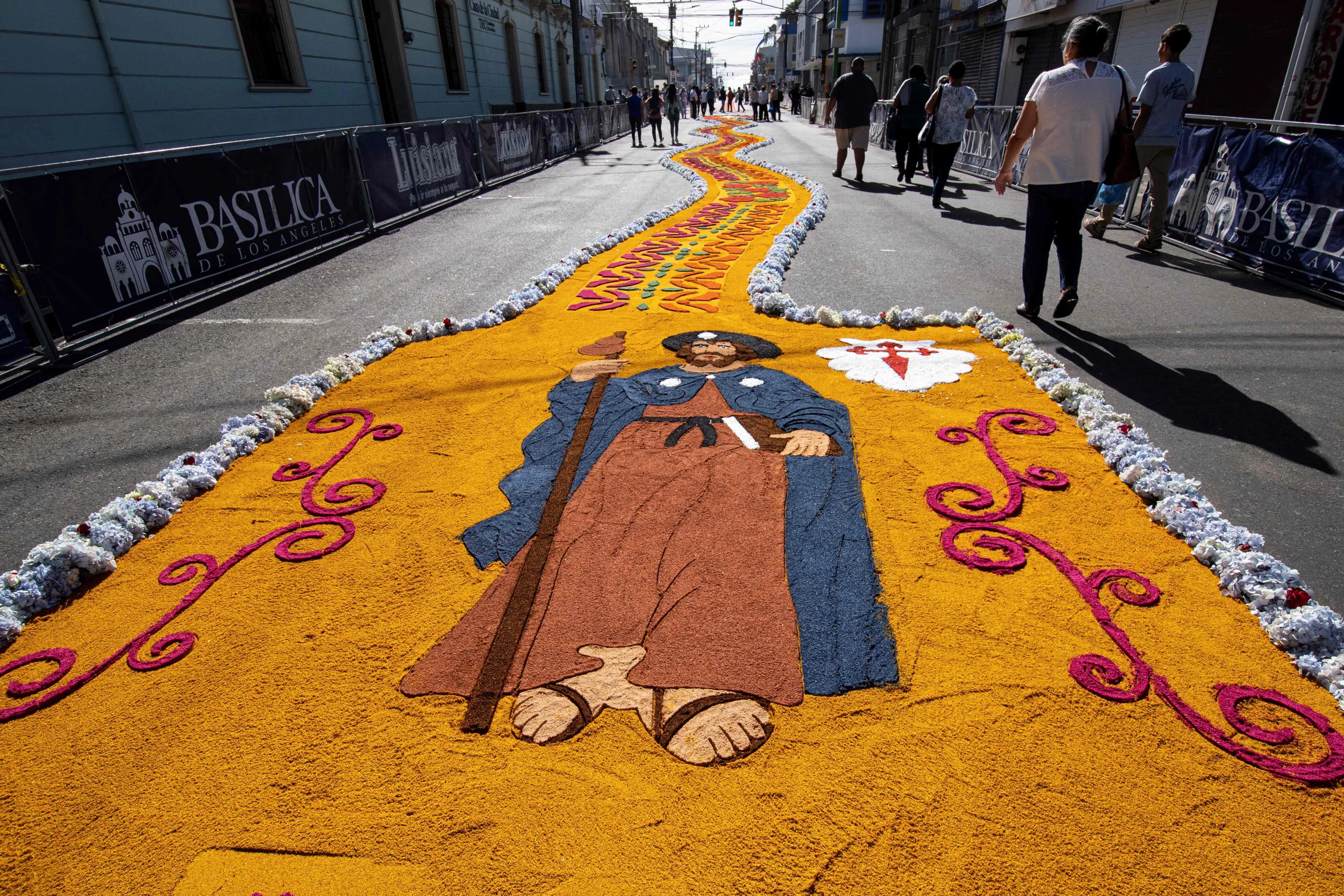 Parishioners walk in a street decorated with colored carpets made of flowers, colored sawdust and recycled plastic, for the procession of the Virgen de Los Angeles, in Cartago, Costa Rica, on September 04, 2022. During the procession, the image of the Virgen de Los Angeles – Costa Rica's patron saint, which spent a month in the Cathedral of Our Lady of Mount Carmel – is carried to the Basilica of Los Angeles. (Photo by Ezequiel Becerra/AFP Photo)