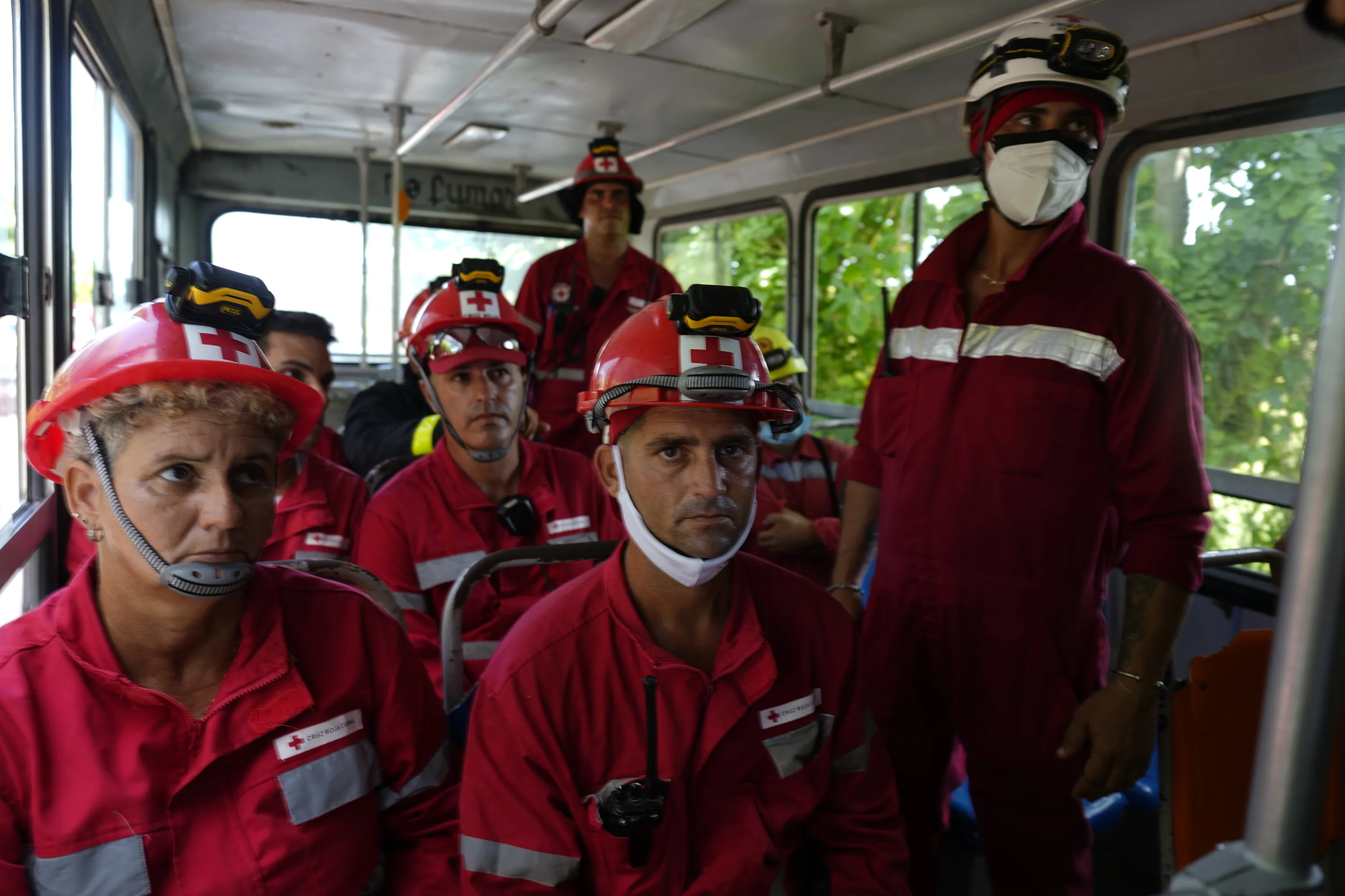Members of the Cuban Red Cross wait to be transported to the Matanzas Supertanker Base, where firefighters work to quell a blaze which began during a thunderstorm the night before, in Matazanas, Cuba, Saturday, August 6, 2022. (Photo by Ramon Espinosa/AP Photo)