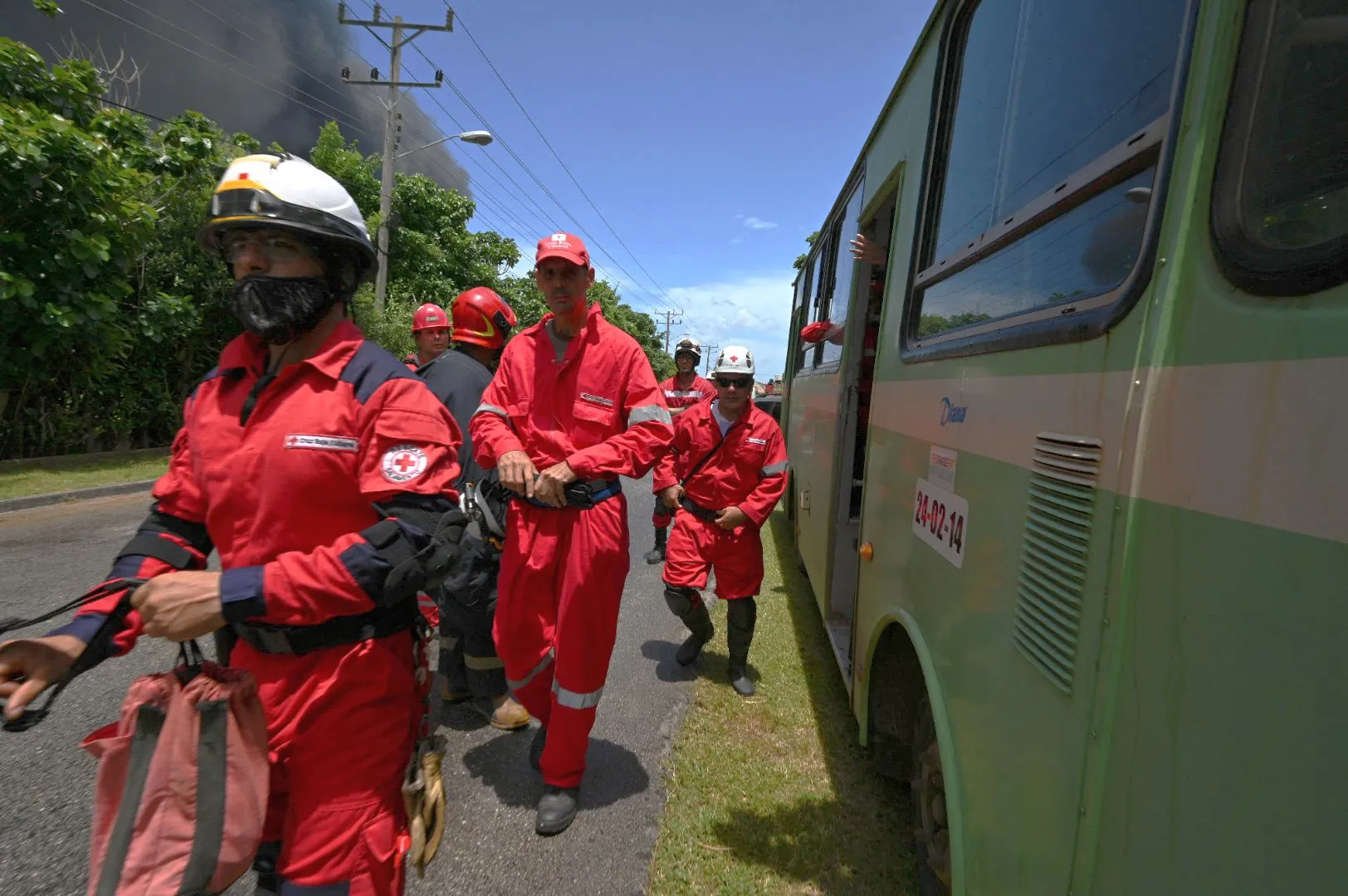 Firefighters walk to a bus near the fire on oil tanks in Matanzas, Cuba, on August 6, 2022. The fire caused by lightning on Friday in a fuel depot in Matanzas, in western Cuba, spread to a second tank at dawn this Saturday and caused 49 injuries, official sources reported. (Photo by Yamil Lage/AFP Photo)