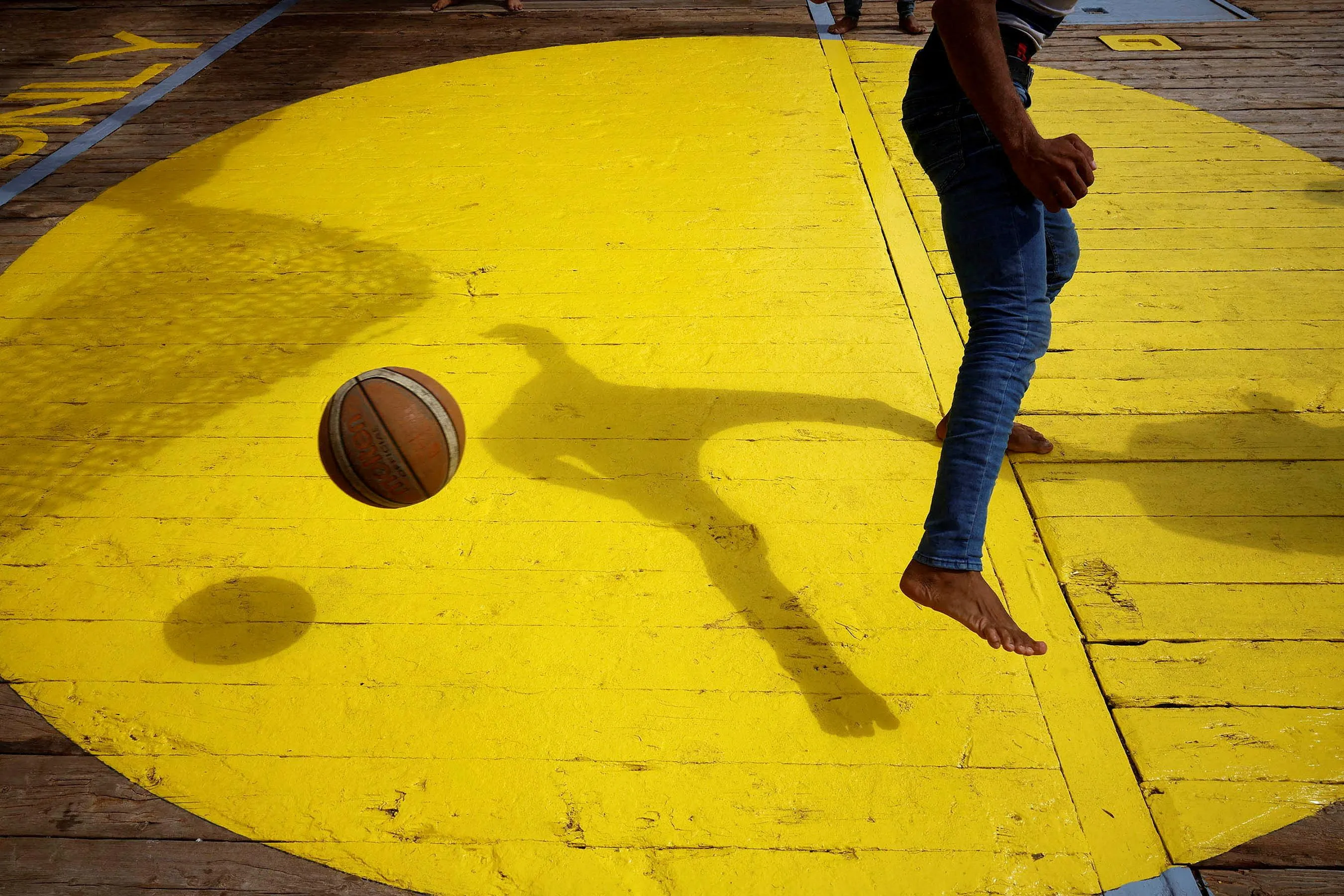 A migrant plays with a ball on his sixth day waiting for a safe port to disembark on board of NGO Proactiva Open Arms Uno rescue boat in central Mediterranean Sea on August 22, 2022. (Photo by Juan Medina/Reuters)