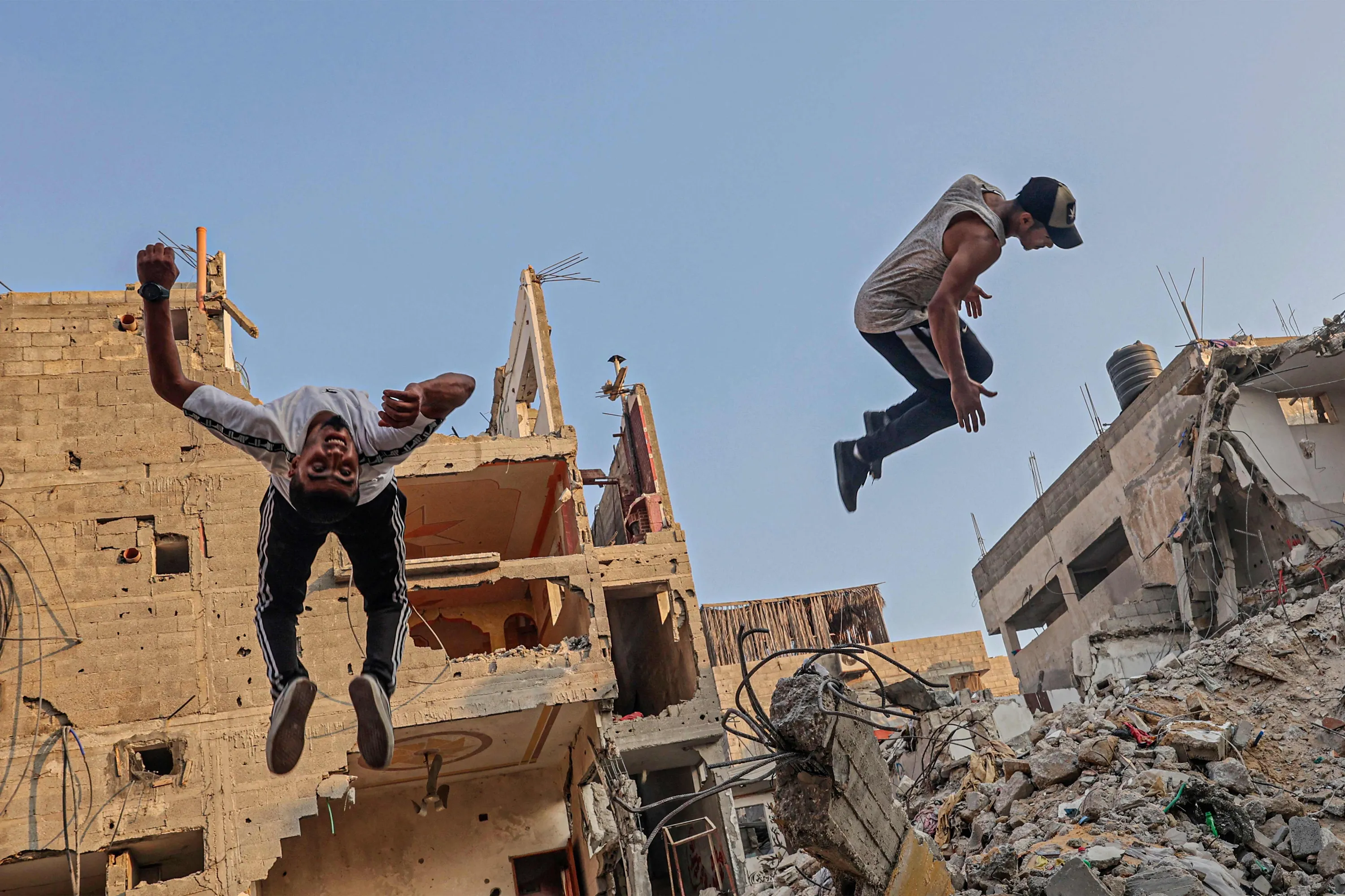 Palestinian youths practise parkour amid the rubble of buildings destroyed by Israeli airstrikes in the latest round of fighting between Israel and Palestinian militants, in Rafah in the southern Gaza Strip, on August 20, 2022. (Photo by Said Khatib/AFP Photo)