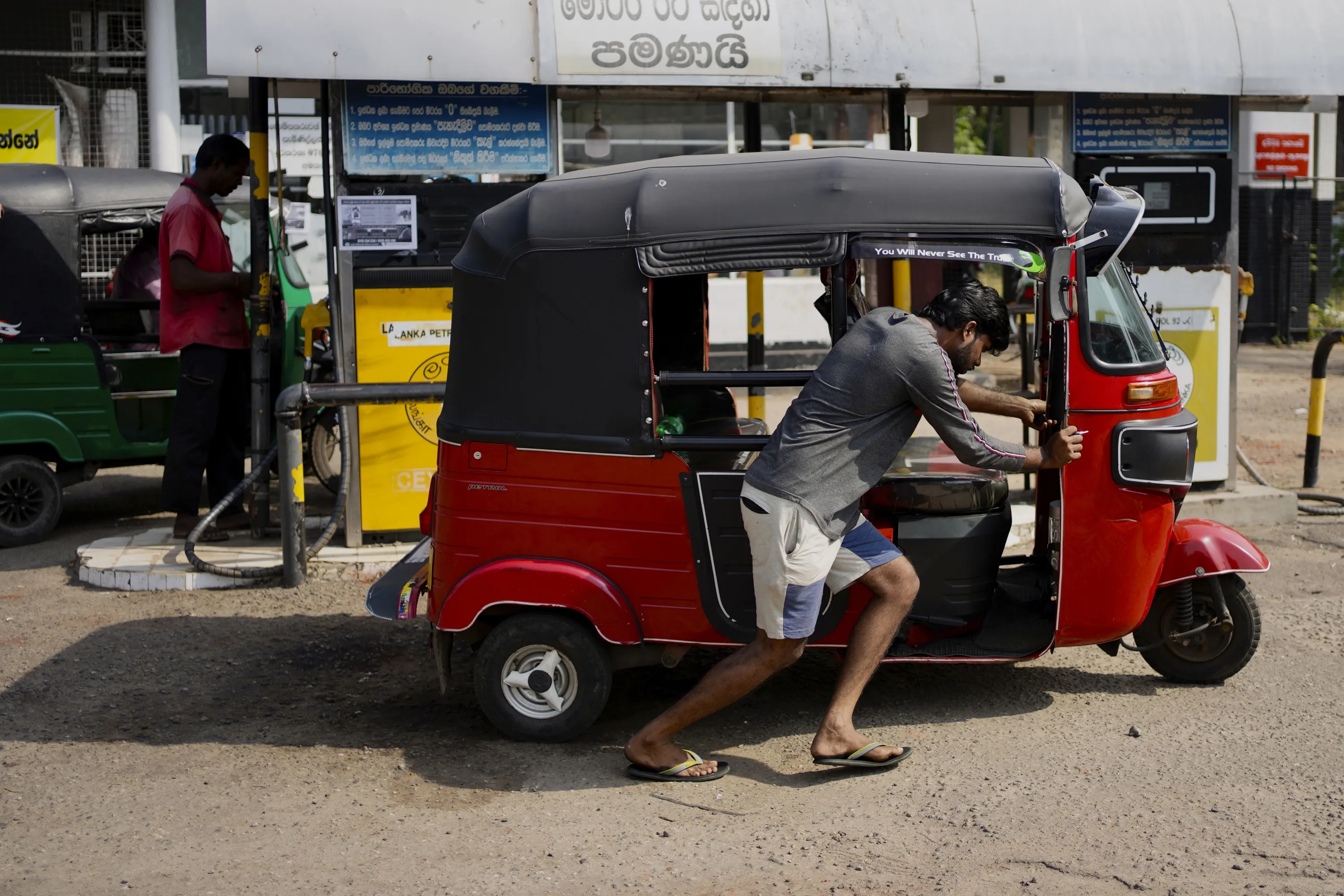 A man pushes his autorickshaw to a fuel station in Colombo, Sri Lanka, Wednesday, July 27, 2022. (Photo by Eranga Jayawardena/AP Photo)