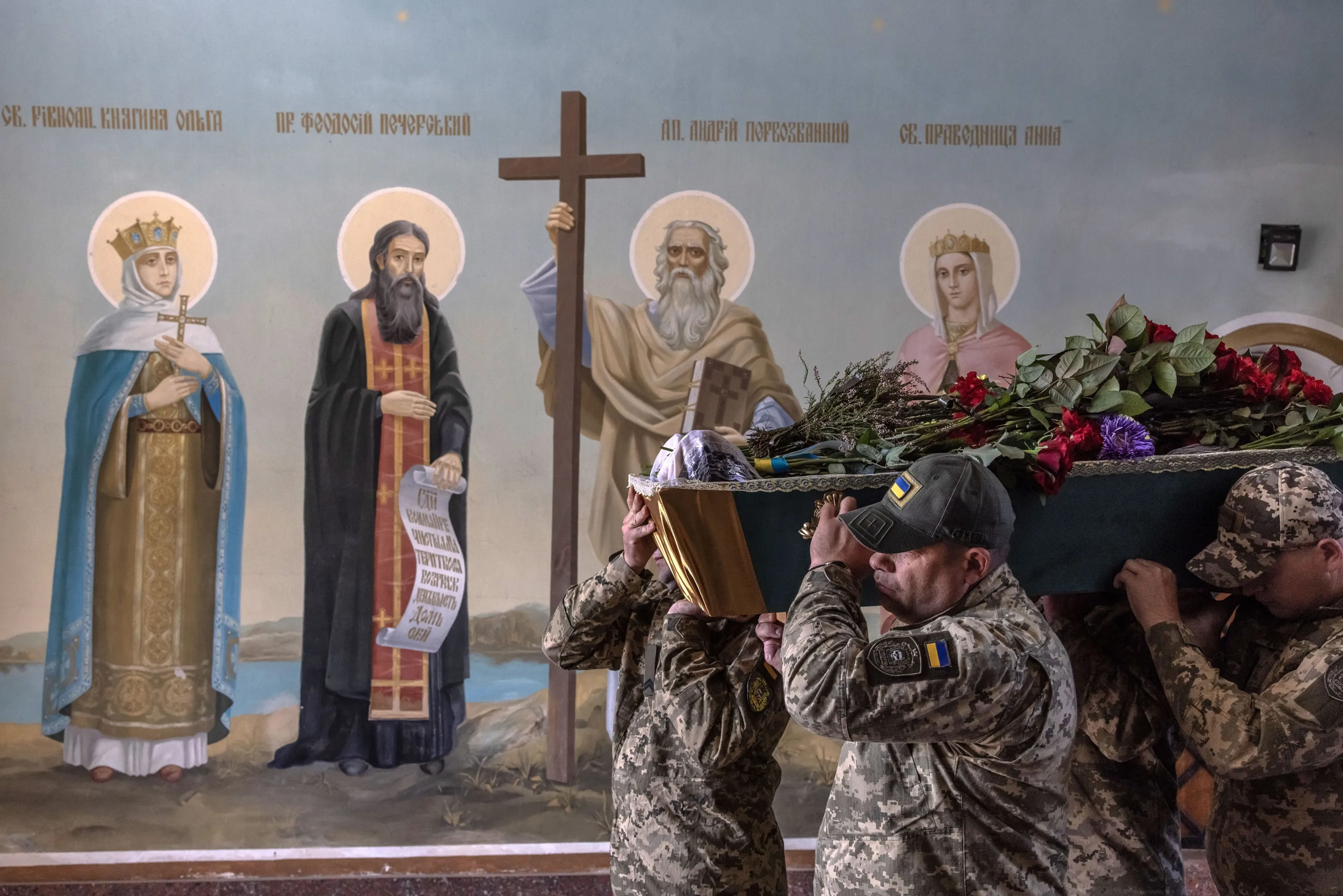 Ukrainian military members carry the coffin of the Ukrainian serviceman Vyacheslav Nalyvayko, killed fighting Russian troops in Kherson region, during the funeral ceremony at St. Michael's Golden-Domed Monastery in Kyiv, Ukraine, 07 September 2022. On 24 February Russian troops invaded Ukrainian territory starting a conflict that has provoked destruction and a humanitarian crisis. (Photo by Roman Pilipey/EPA/EFE/Rex Features/Shutterstock)