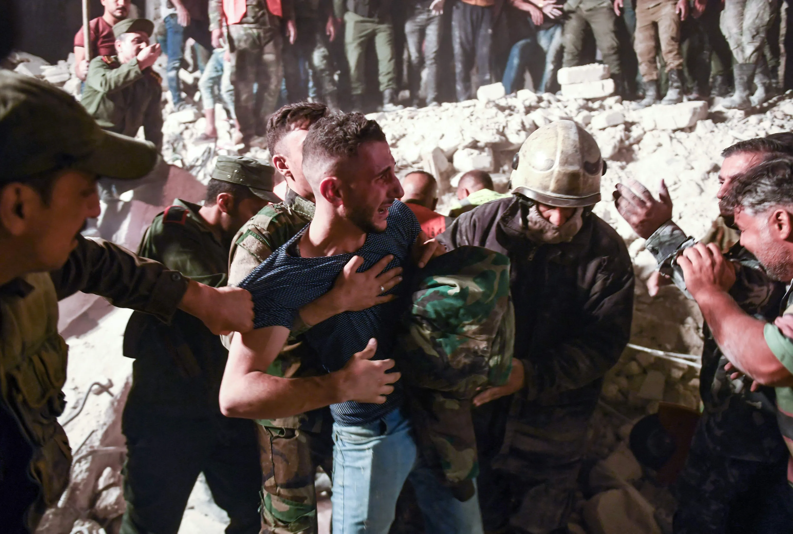 A man reacts as rescuers search for victims and survivors amidst the rubble of a building that collapsed in Syria's northern city of Aleppo, on September 7, 2022. Ten people were killed when a five-story building collapsed in the Ferdaws neighbourhood of Aleppo, state media said. “The bodies of six women, three children and a man were recovered, while a child and a woman were rescued from under the rubble and taken to hospital”, the official SANA news agency said. (Photo by AFP Photo/Stringer)