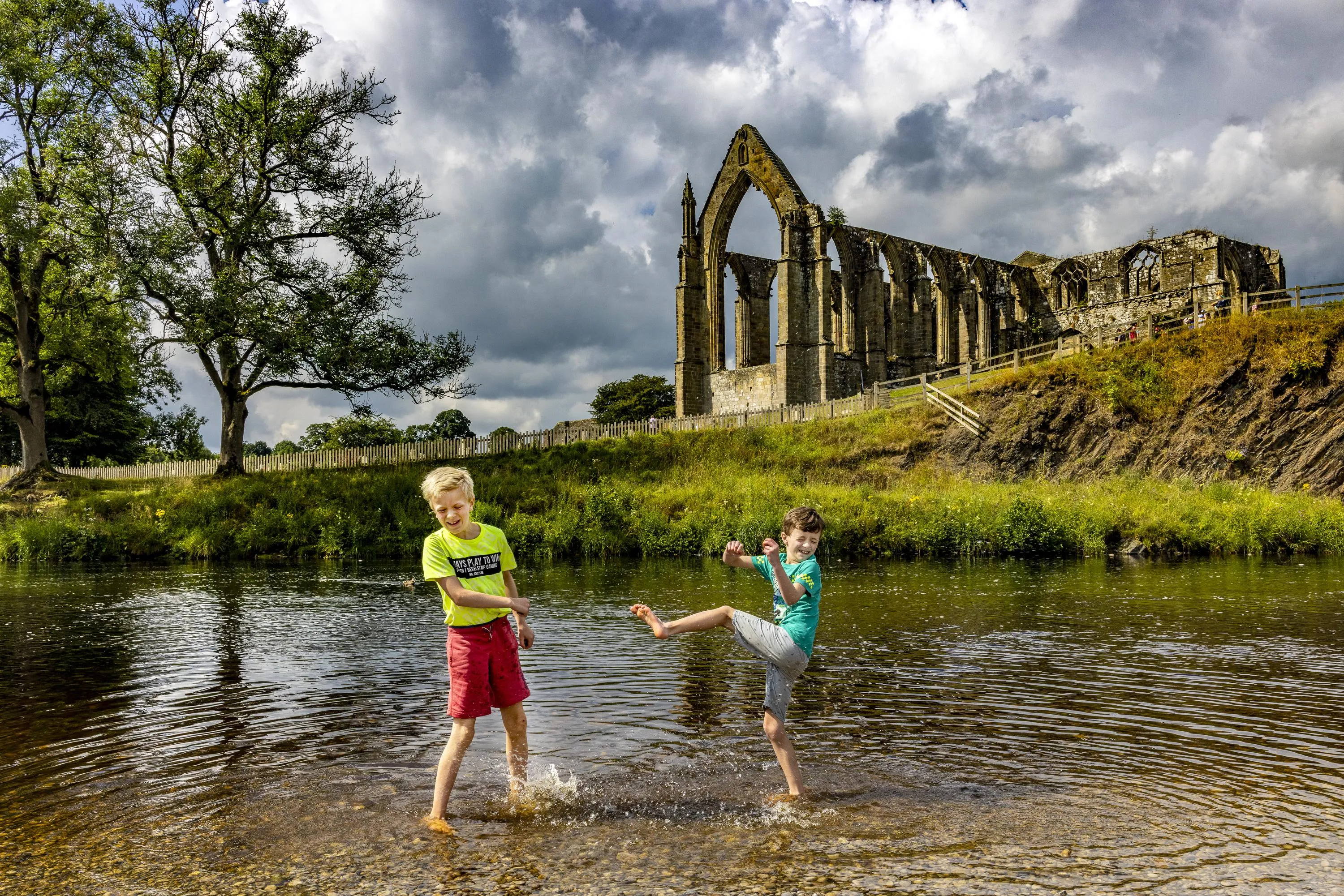 Brothers Daniel and Vincent van der Noort, from the Netherlands, play at Bolton Abbey, North Yorkshire, while on holiday on July 26, 2022. (Photo by James Glossop/The Times)
