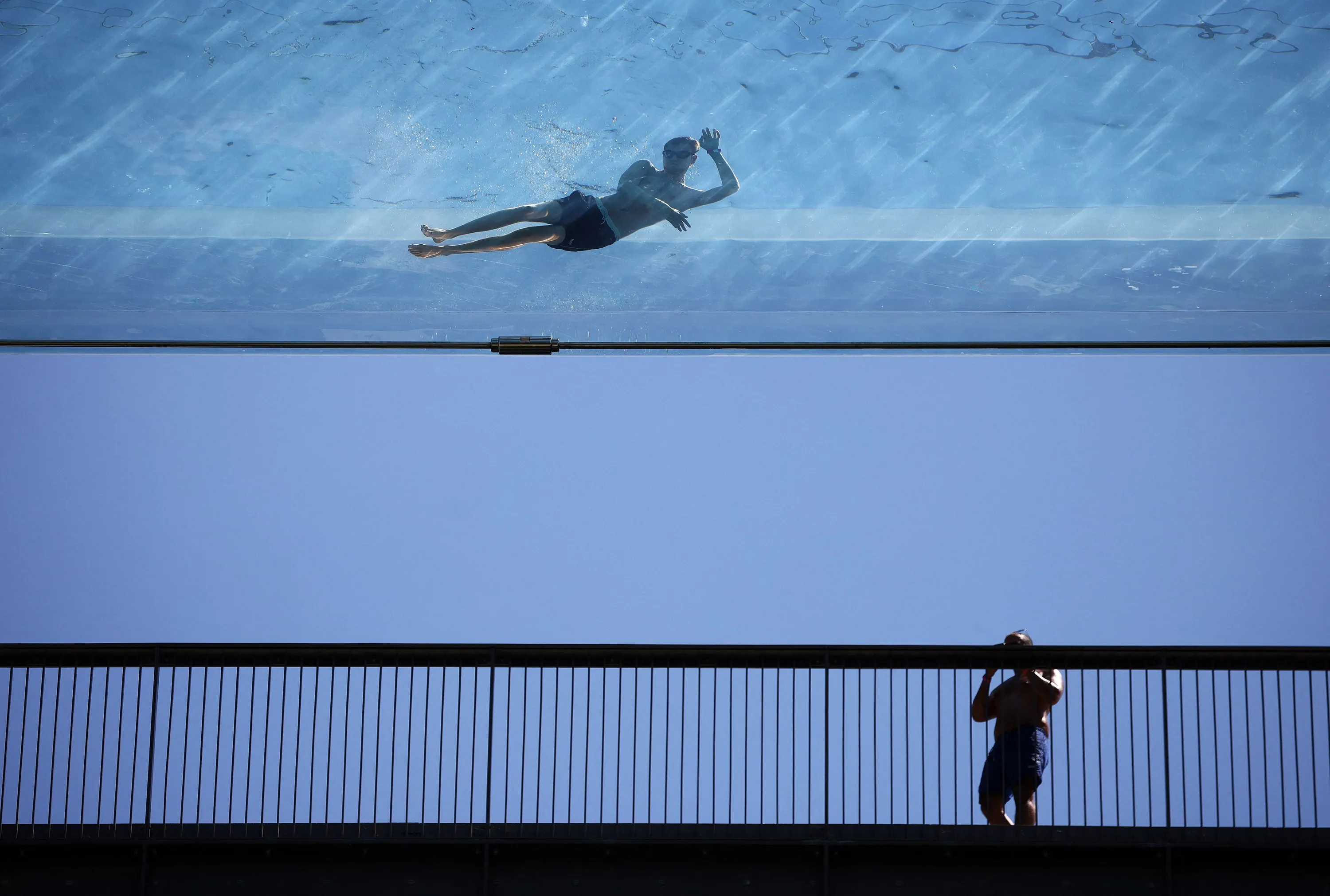 A person swims at the Embassy Gardens Sky Pool, a transparent acrylic swimming pool suspended between two apartment buildings, during hot weather in London, Britain, July 10, 2022. (Photo by Henry Nicholls/Reuters)