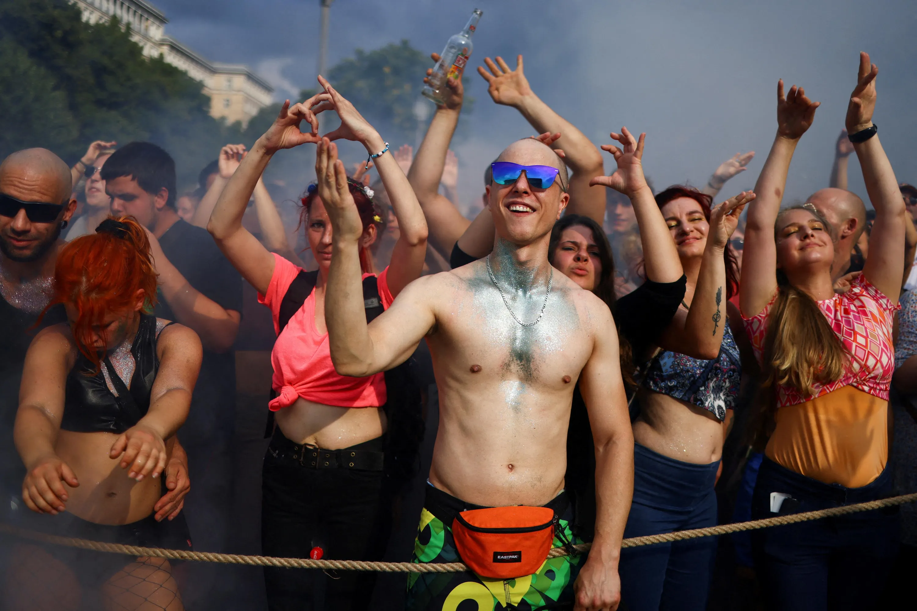 People attend the 2022 “Train of Love” (Zug der Liebe) techno parade in Berlin, Germany on August 27, 2022. (Photo by Christian Mang/Reuters)