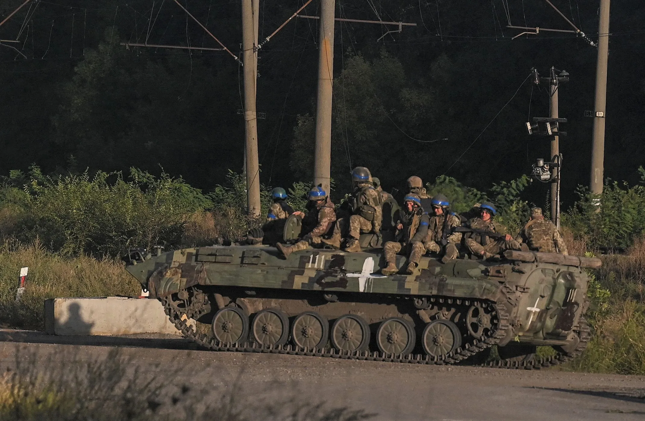 Ukrainian army's fighters sit on the top of an armed vehicle in kharkiv on September 9, 2022, amid Russian invasion of Ukraine. (Photo by Juan Barreto/AFP Photo)