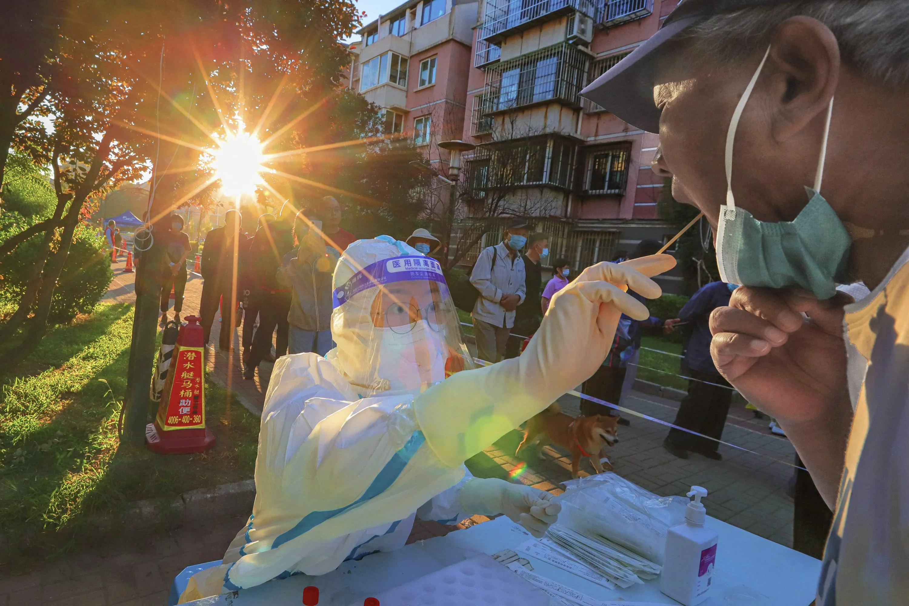 This photo taken on August 31, 2022 shows a health worker taking a swab sample from a man to be tested for the Covid-19 coronavirus in China's northern Tianjin. (Photo by CNS/AFP Photo)