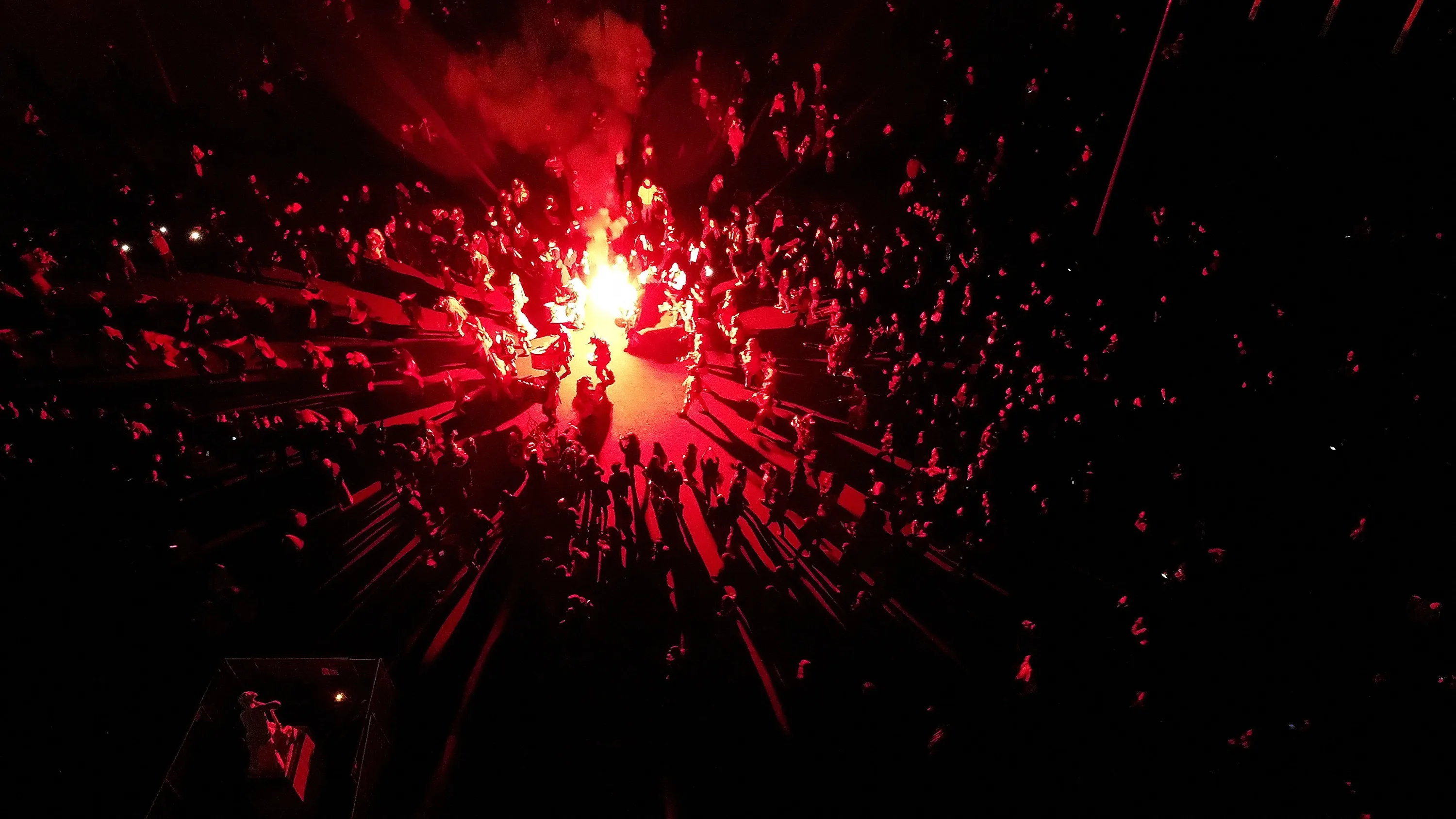 Los Diablos Rojos (Red Devils) music and dance group use a flare as they dance inside Chile's national stadium, which was used as a detention and torture centre, while marking the 49th anniversary of the coup d'etat in Chile that ushered in a 17-year dictatorship under Augusto Pinochet's regime, in Santiago, Chile September 11, 2022. (Photo by Ivan Alvarado/Reuters)
