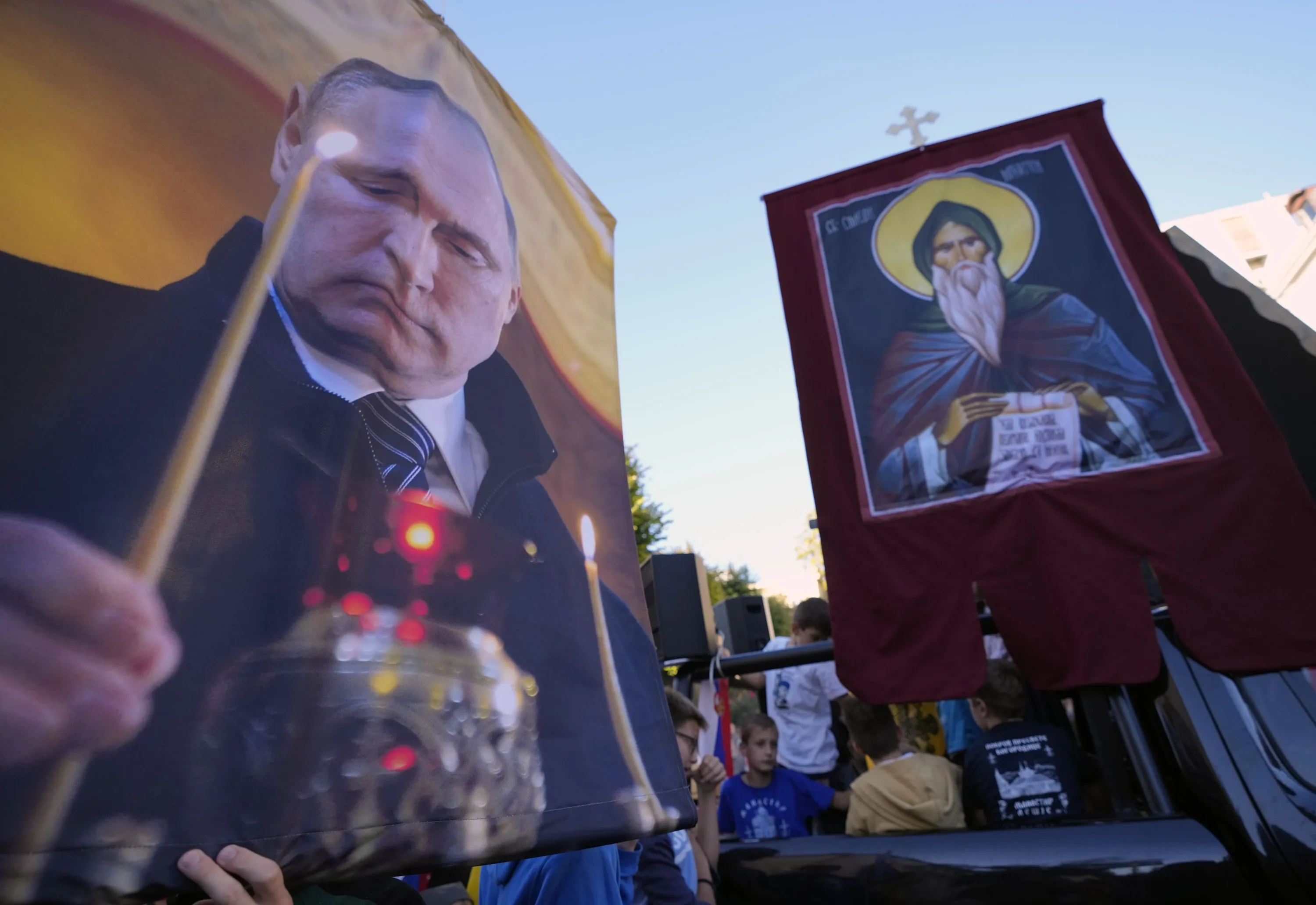 People hold icons and a picture of Russian President Vladimir Putin during a protest against the international LGBT event Euro Pride in Belgrade, Serbia, Sunday, September 11, 2022. Thousands of opponents of a pan-European LGBTQ event planned for this week in Belgrade marched through the Serbian capital on Sunday despite an announced ban of Europe's largest annual gay gathering. (Photo by Darko Vojinovic/AP Photo)