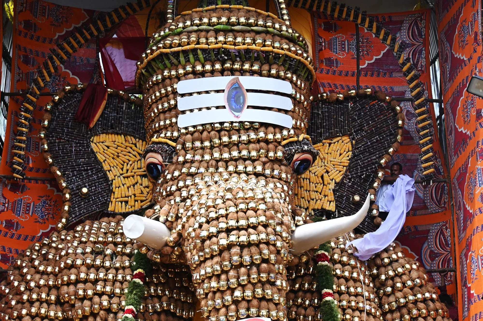 A man (R) removes a cloth to unveil a 30-feet statue of Elephant headed hindu god Ganesha made Metal pots, coconut ,corn and sugarcane at a place worship on Ganesh Chaturthi festival in Chennai on August 31, 2022. (Photo by Arun Sankar/AFP Photo)