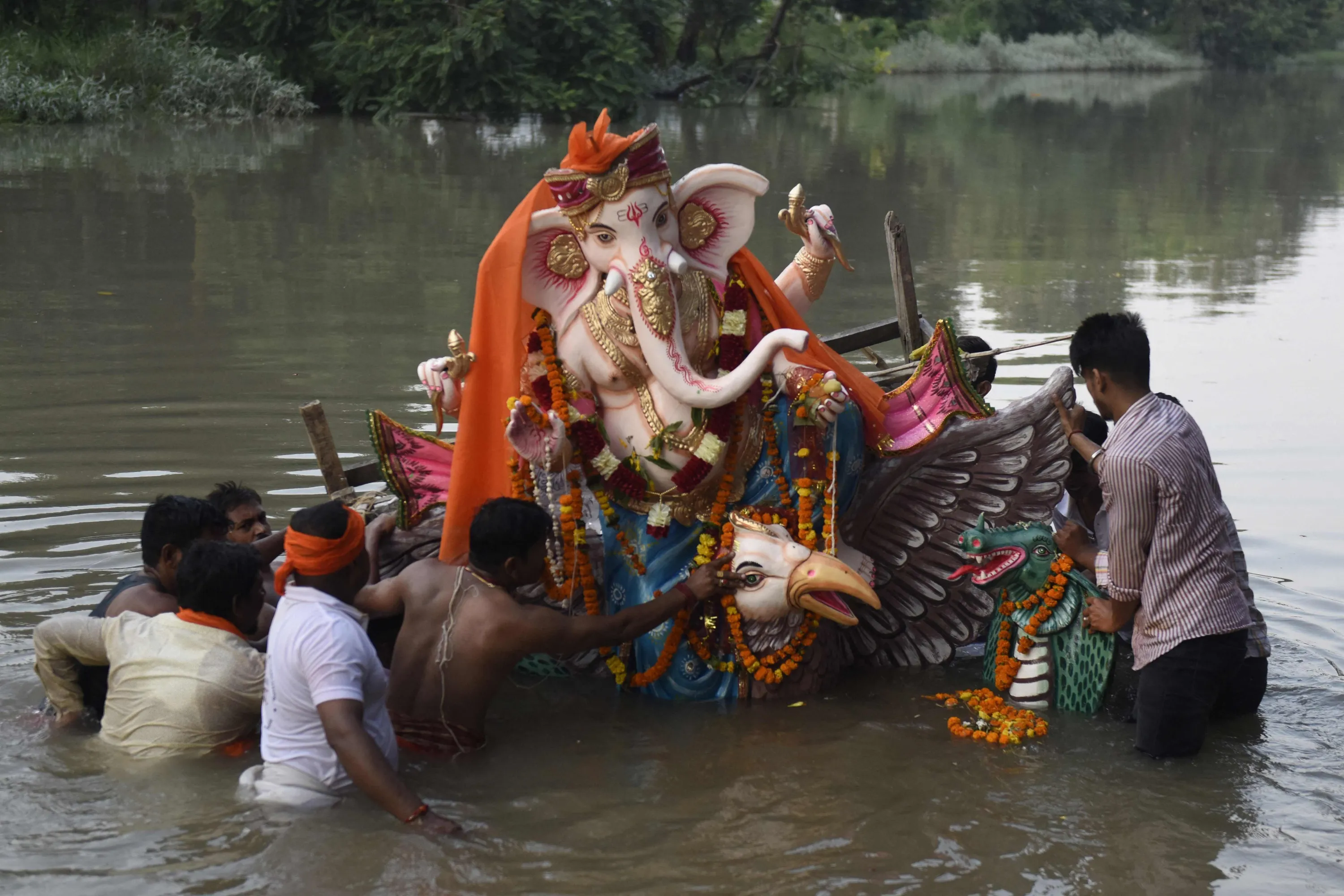 Hindu devotees immerse an idol of the elephant-headed Hindu God Ganesha in a river during the ten-day-long “Ganesh Chaturthi” festival on the outskirts of Amritsar on September 2, 2022. (Photo by Narinder Nanu/AFP Photo)