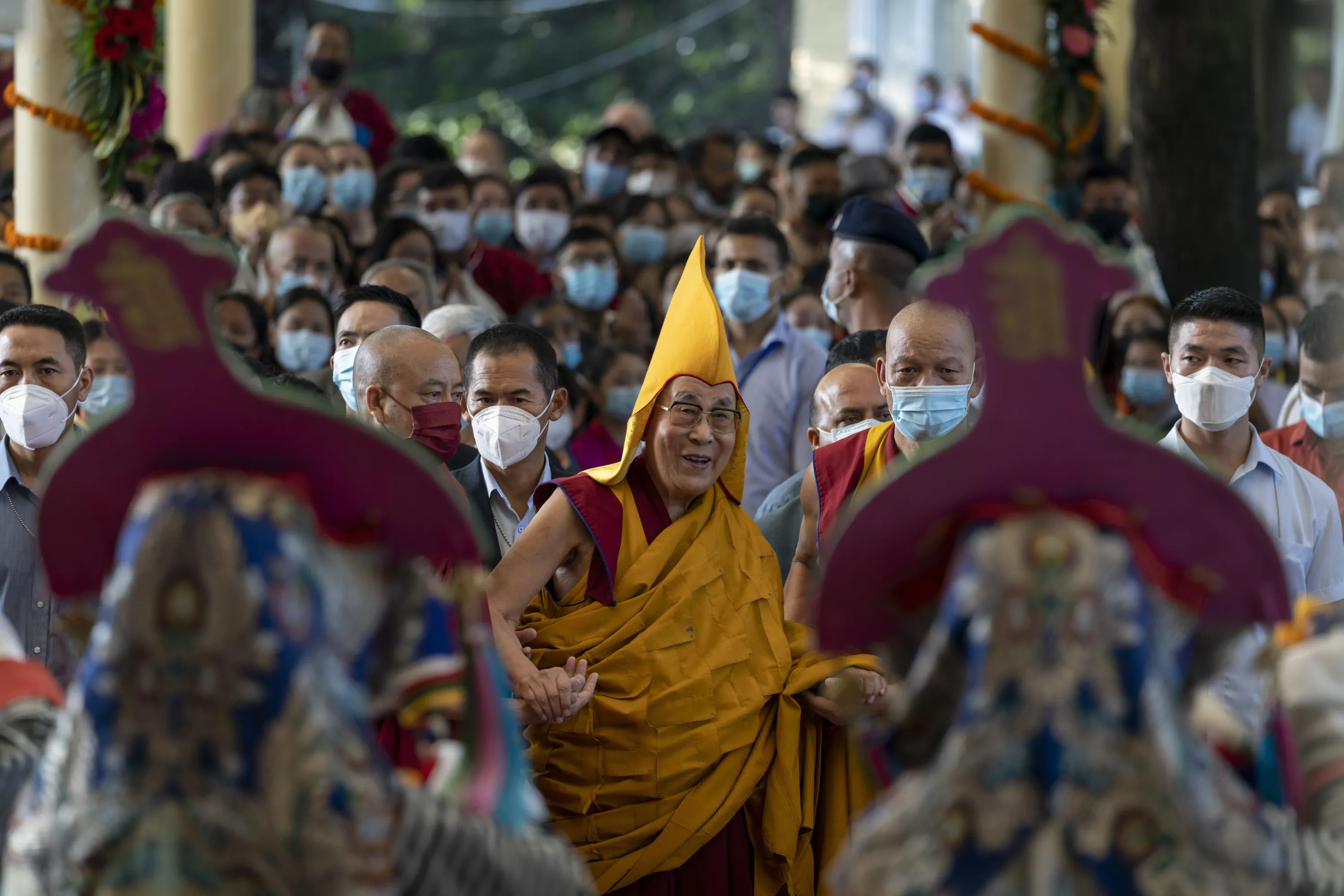 Tibetan spiritual leader the Dalai Lama, center, in a yellow ceremonial hat, watches a welcome dance performed by Tibetan artists, as he arrives at the Tsuglakhang temple in Dharmsala, India, Wednesday, September 7, 2022. Exiled Tibetans prayed for the long life of their spiritual leader. (Photo by Ashwini Bhatia/AP Photo)