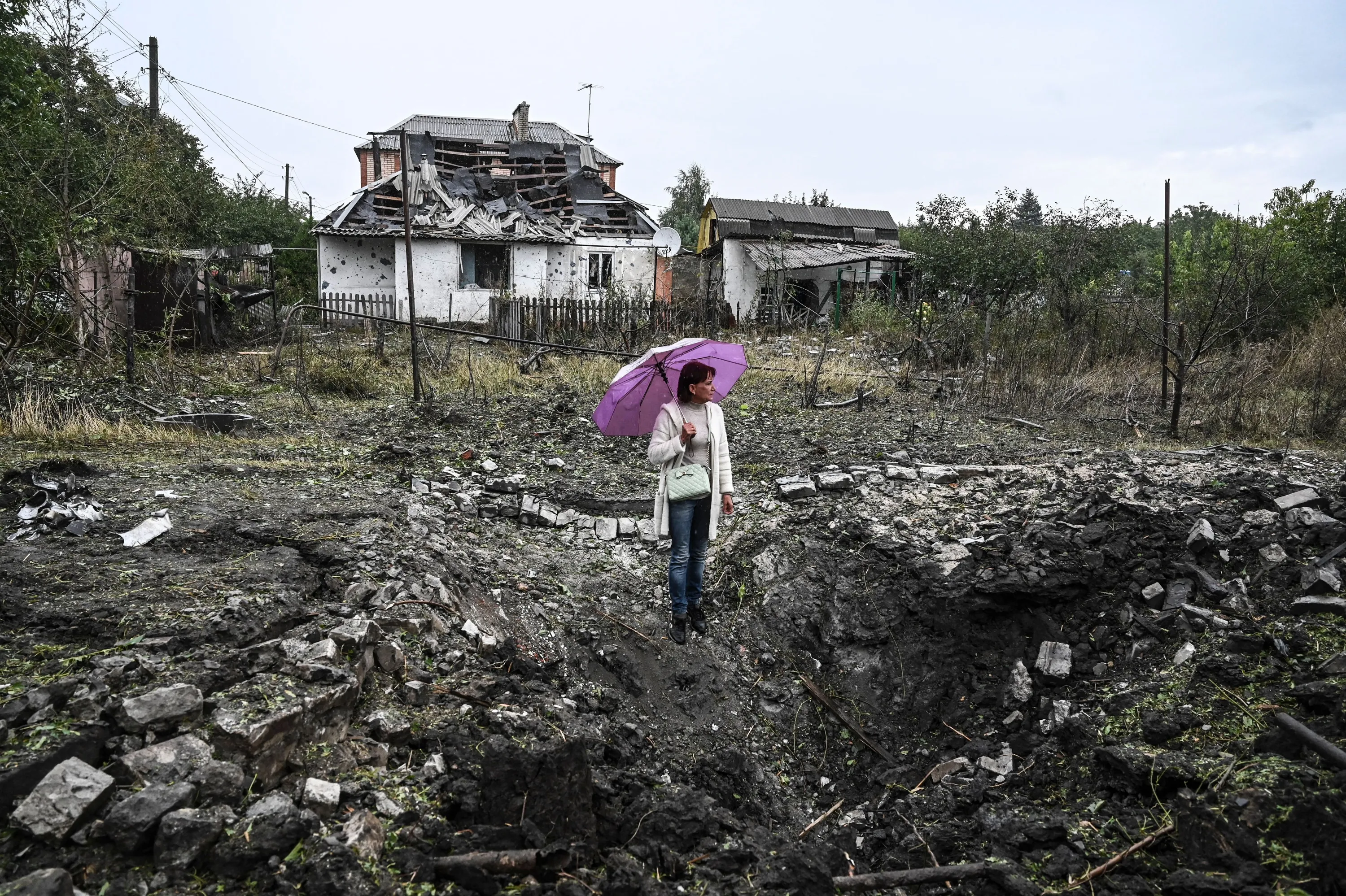 A woman stands in front of a destroyed house, in Kramatorsk, Donetsk region, on September 12, 2022, amid the Russian invasion of Ukraine. (Photo by Juan Barreto/AFP Photo)