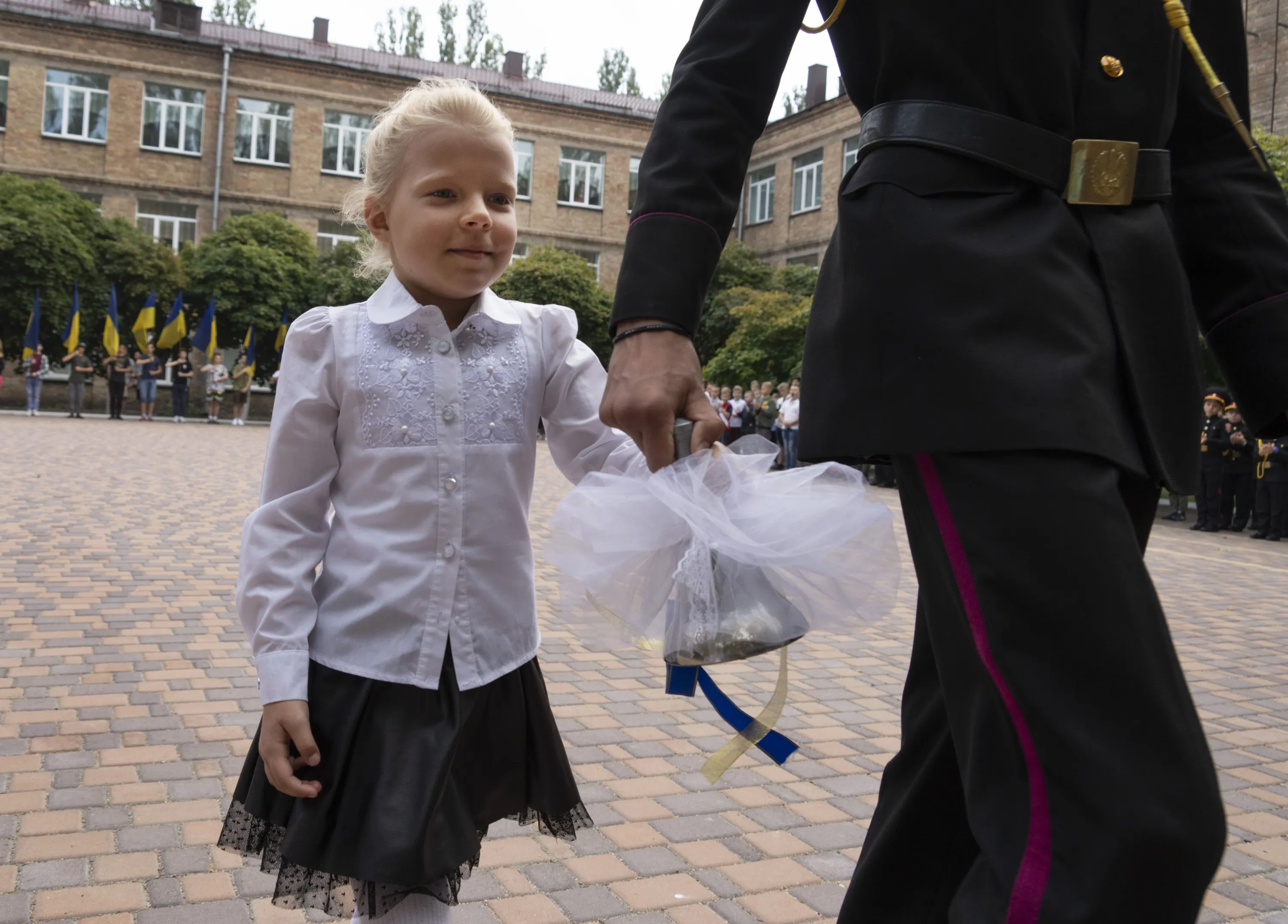 A graduate cadet holds the hand of a young schoolgirl and rings the bell on the first day of school at a cadet lyceum in Kyiv, Ukraine, Thursday, September 1, 2022. (Photo by Efrem Lukatsky/AP Photo)