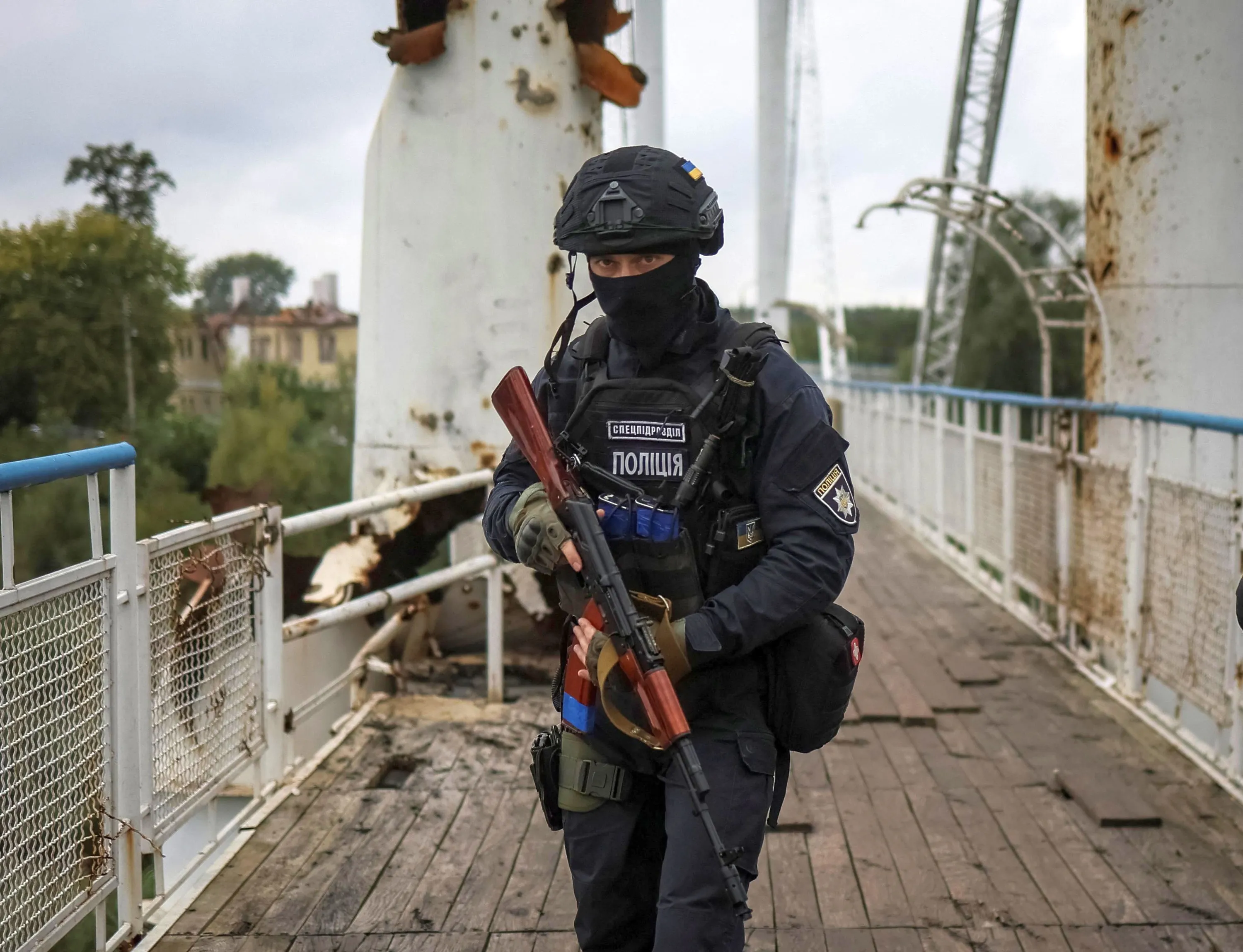 Ukrainian police officer patrols an area, as Russia's attack on Ukraine continues, in the town of Izium, recently liberated by Ukrainian Armed Forces, in Kharkiv region, Ukraine on September 14, 2022. (Photo by Gleb Garanich/Reuters)