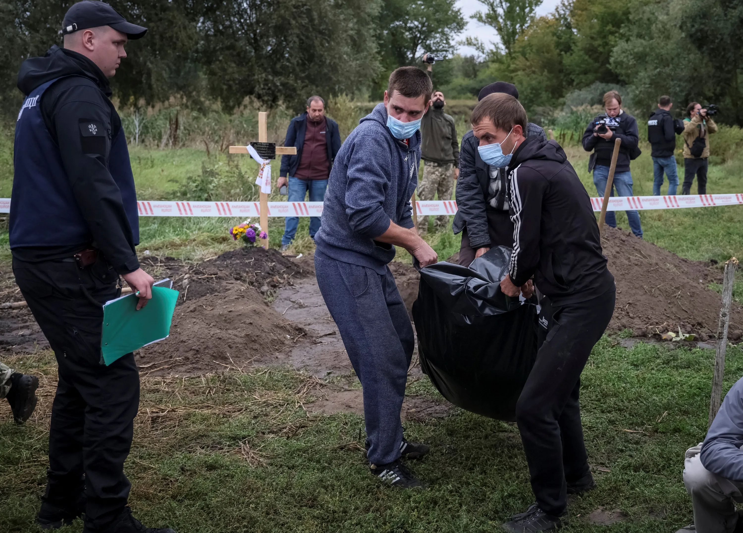 A police officer looks on as workers carry the body of a person who, according to Ukrainian police, was killed by Russian troops during Russia's invasion, in the town of Balakliia, recently liberated by Ukrainian Armed Forces, in Kharkiv region, Ukraine on September 13, 2022. (Photo by Gleb Garanich/Reuters)