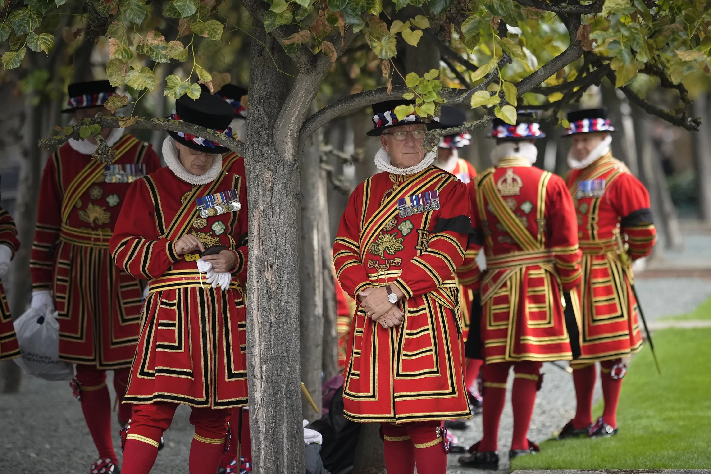 The Yeomen Warders of His Majesty's Royal Palace and Fortress of the Tower of London, commonly known as Beefeaters, take a break in Westminster Hall Gardens on September 15, 2022 in London, England. Queen Elizabeth II is lying in state at Westminster Hall until the morning of her funeral to allow members of the public to pay their last respects. Elizabeth Alexandra Mary Windsor was born in Bruton Street, Mayfair, London on 21 April 1926. She married Prince Philip in 1947 and acceded to the throne of the United Kingdom and Commonwealth on 6 February 1952 after the death of her Father, King George VI. Queen Elizabeth II died at Balmoral Castle in Scotland on September 8, 2022, and is succeeded by her eldest son, King Charles III (Photo by Christopher Furlong/Getty Images)