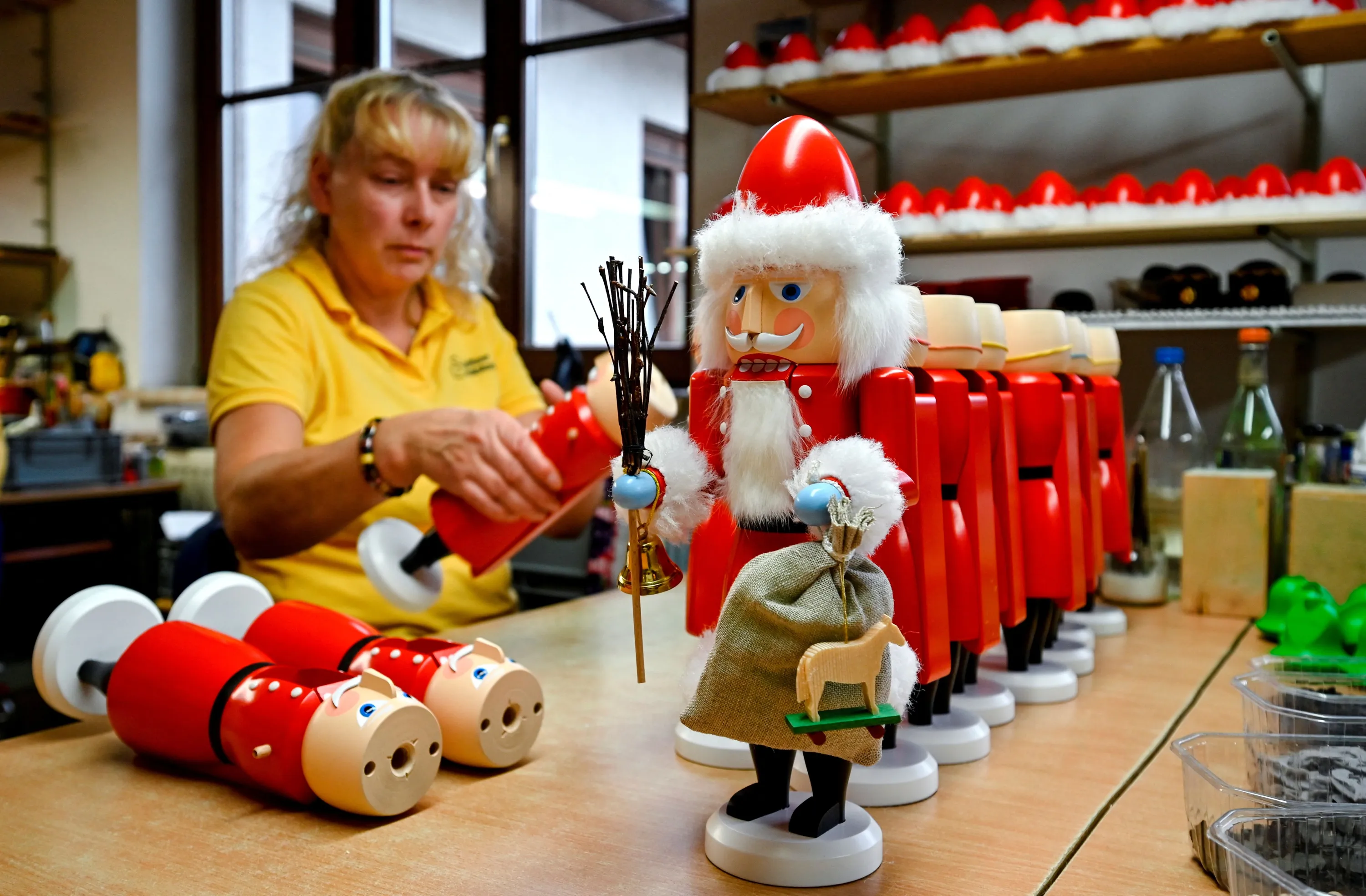 An employee assembles nutcrackers at the workshop of wood art manufacturer Seiffener Volkskunst in Seiffen, Germany on September 14, 2022. (Photo by Matthias Rietschel/Reuters)