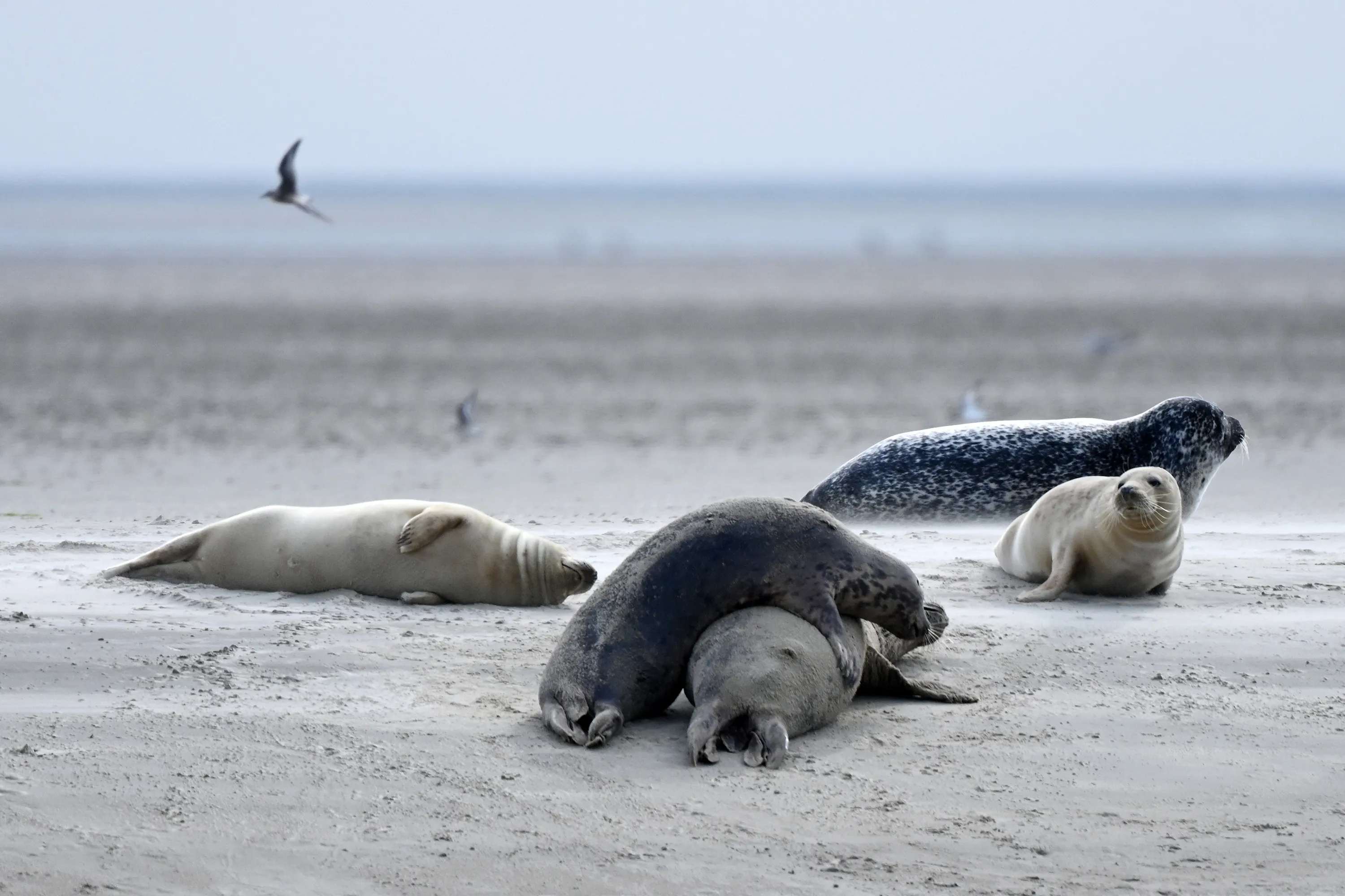 Seals lie on the beach of North Sea in the village of Sonderho, Denmark on September 06, 2022. (Photo by Sergei Gapon/Anadolu Agency via Getty Images)
