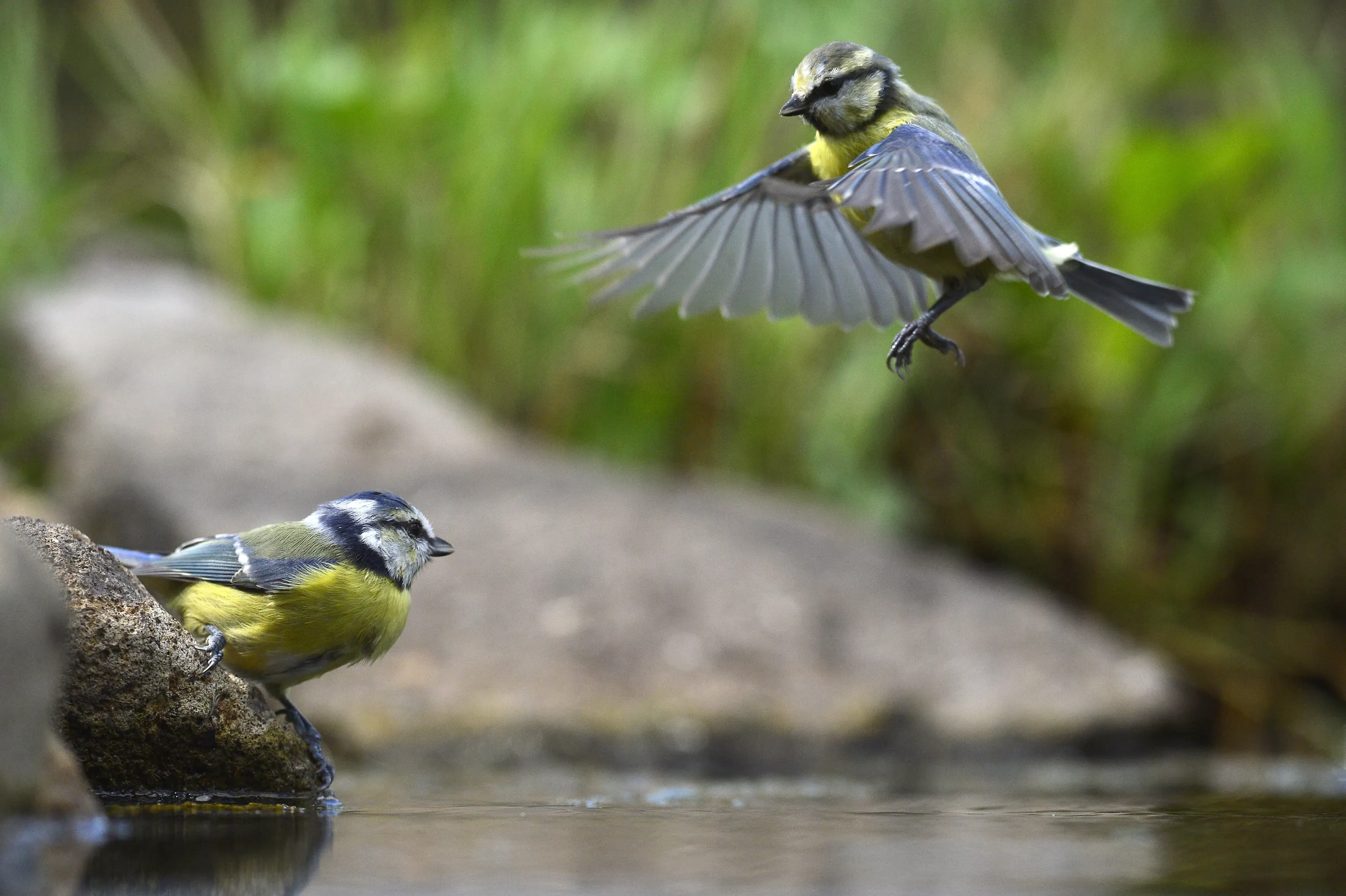 Blue tits (Cyanistes caeruleus) refresh themselves at a pond near Tiszaalpar, Hungary, 29 August 2022. (Photo by Attila Kovacs/EPA/EFE)