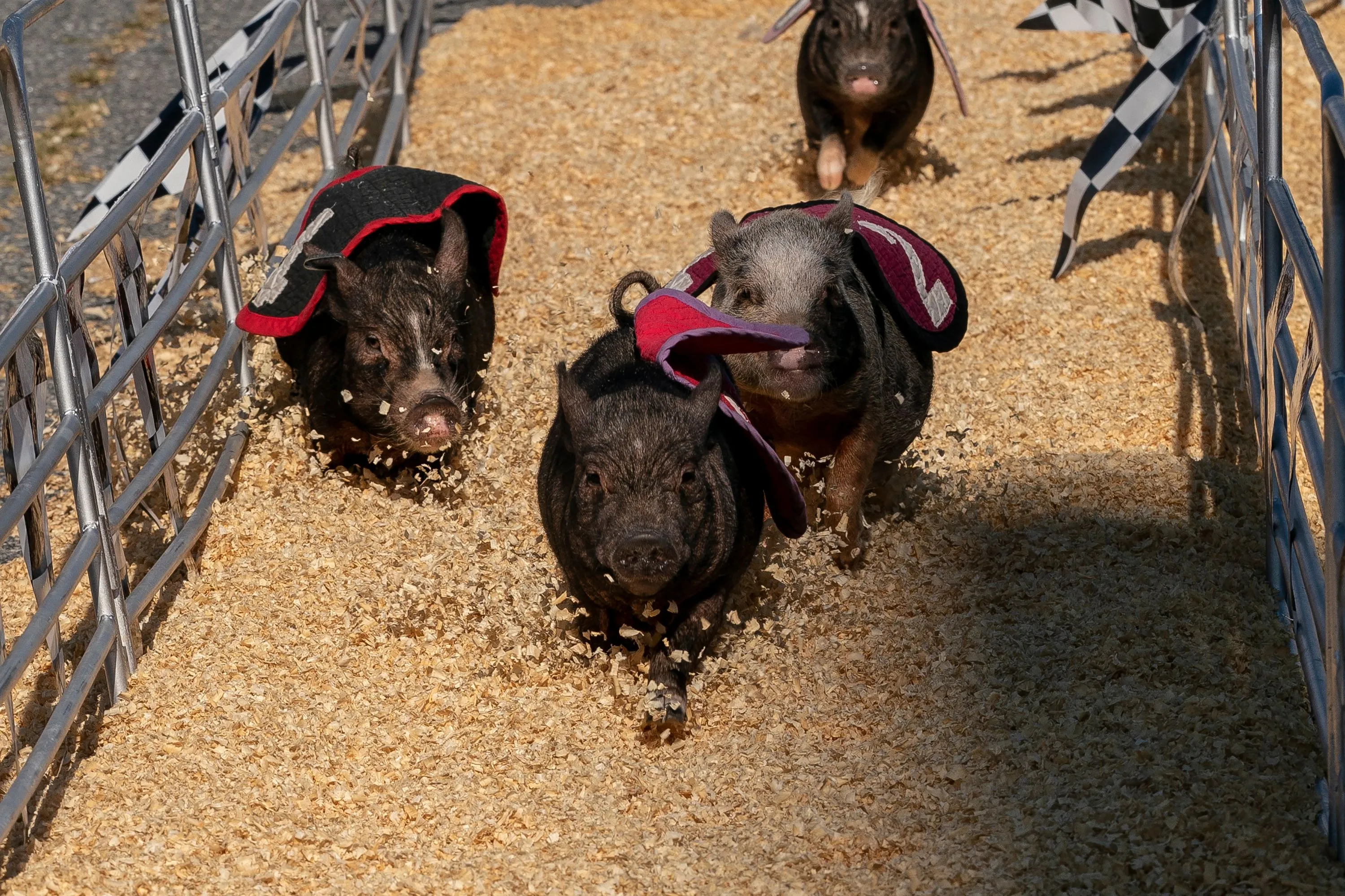 Pigs run during the swifty swine pig race at the Maryland State Fair in Lutherville-Timonium, Maryland, on September 9, 2022. (Photo by Stefani Reynolds/AFP Photo)