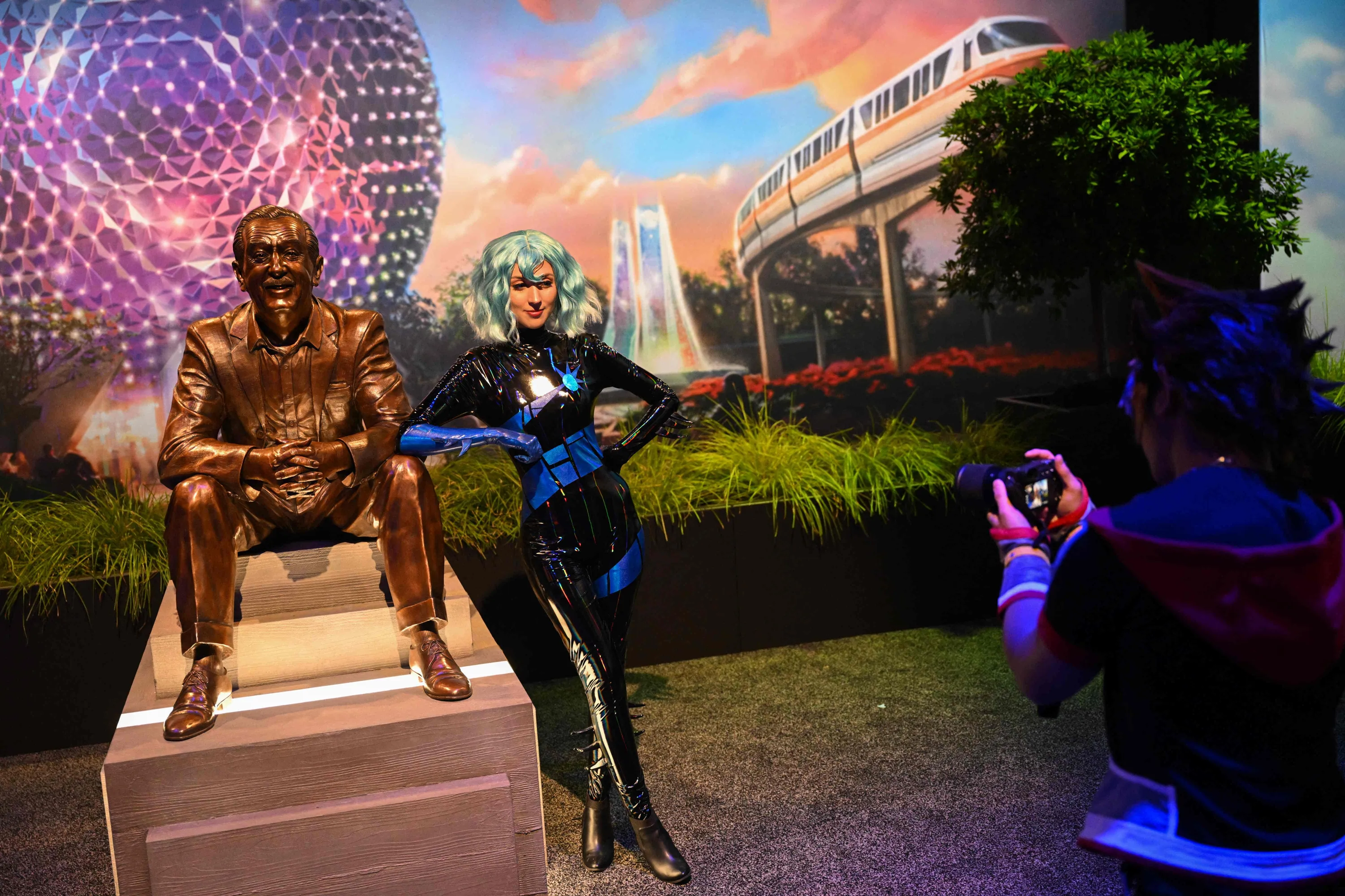 An attendee in costume poses for a picture with the Walt The Dreamer statue during the Walt Disney D23 Expo in Anaheim, California on September 9, 2022. (Photo by Patrick T. Fallon/AFP Photo)