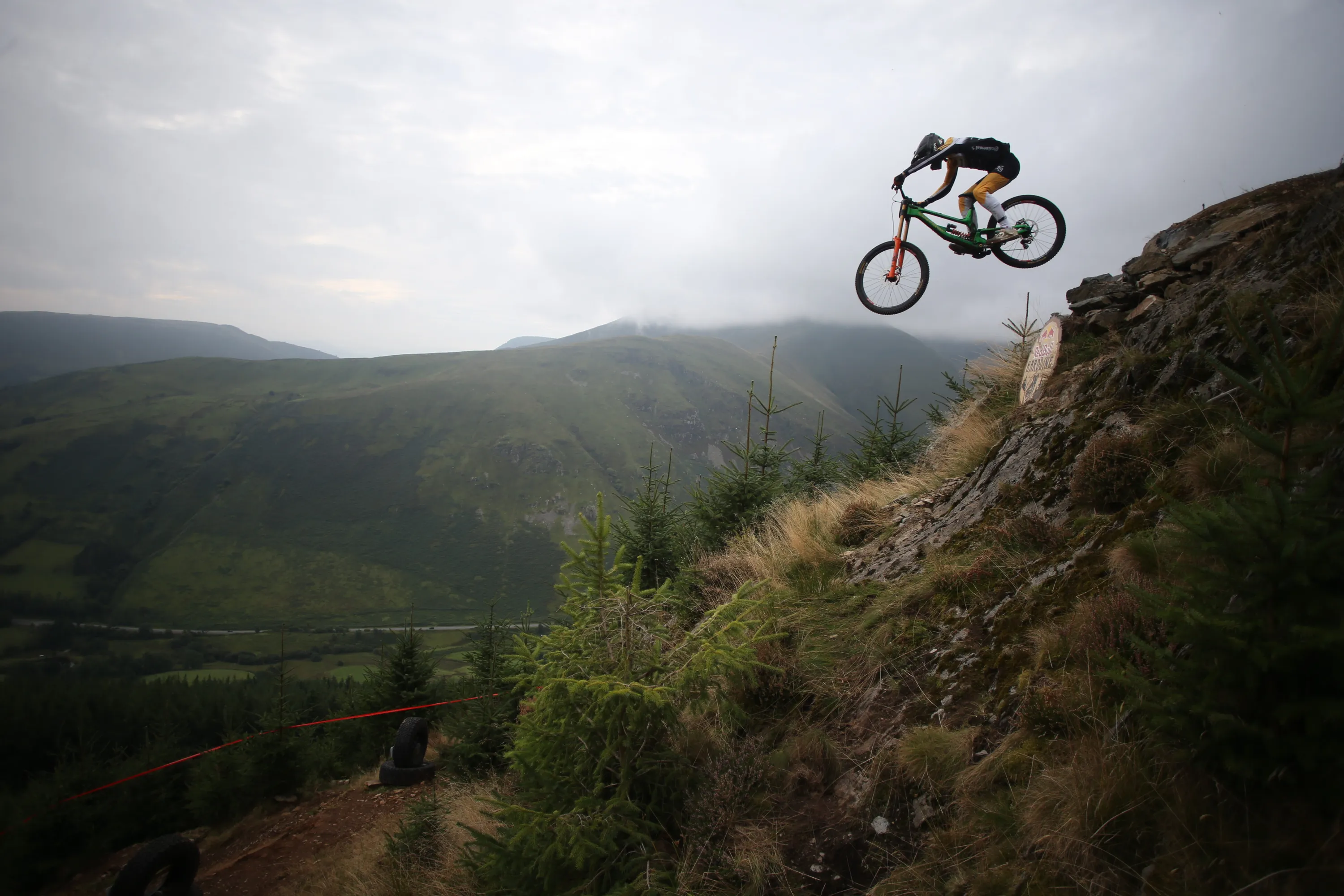 Chris Cumming riding in the Red Bull Hardline downhill mountain bike race at the Machynlleth course, Wales on Sunday, September 11, 2022. (Photo by Matthew Lewis/Getty Images for Red Bull)