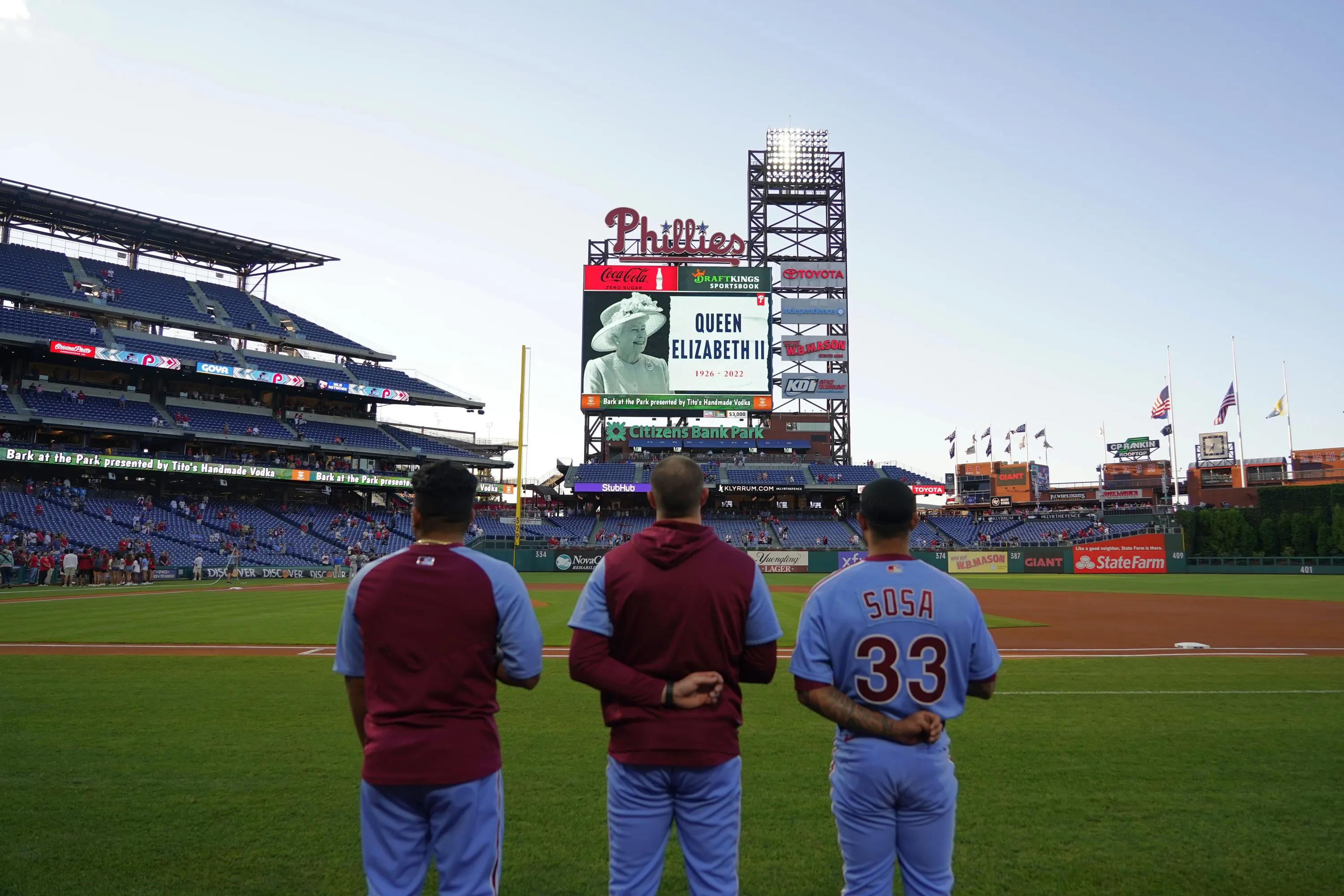 Philadelphia Phillies' players stand before a baseball game against the Miami Marlins for a tribute to Queen Elizabeth II, Britain's longest-reigning monarch who died after 70 years on the throne, Thursday, September 8, 2022, in Philadelphia. (Photo by Matt Slocum/AP Photo)