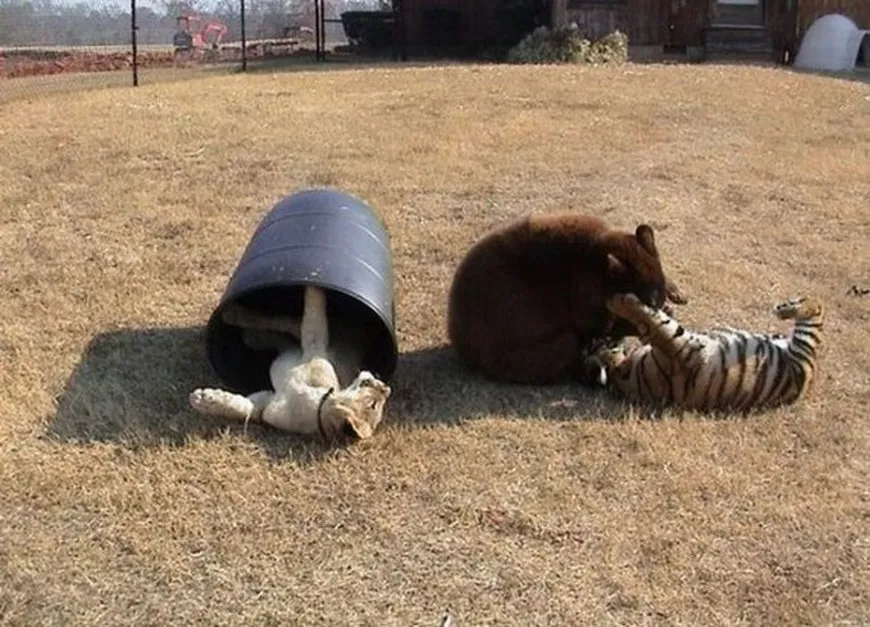 They make an unlikely trio, but Baloo the bear, Leo the lion and Shere Khan the tiger have forged an unusually strong bond. Considering that they would be mortal enemies if they ever were to meet in the wild, it is stunning to see their unique and genuine friendship in these intimate pictures. Rescued eight years ago during a police drugs raid in Atlanta, Georgia, the three friends were only cubs at the time at barely two months old.