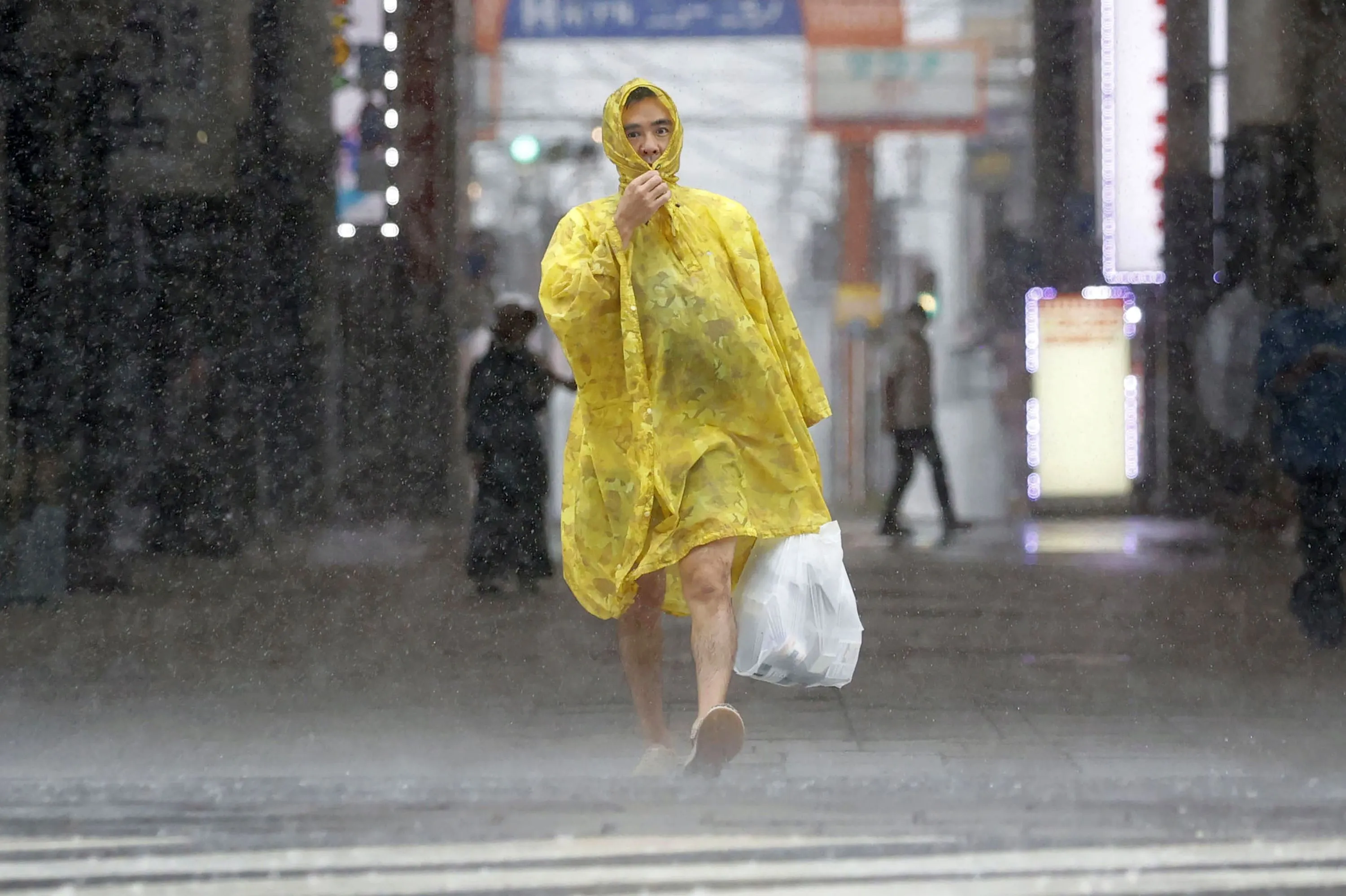 A man makes his way through the heavy rain caused by a powerful typhoon in Kagoshima, southern Japan, Sunday, September 18, 2022. (Photo by Kyodo News via AP Photo)