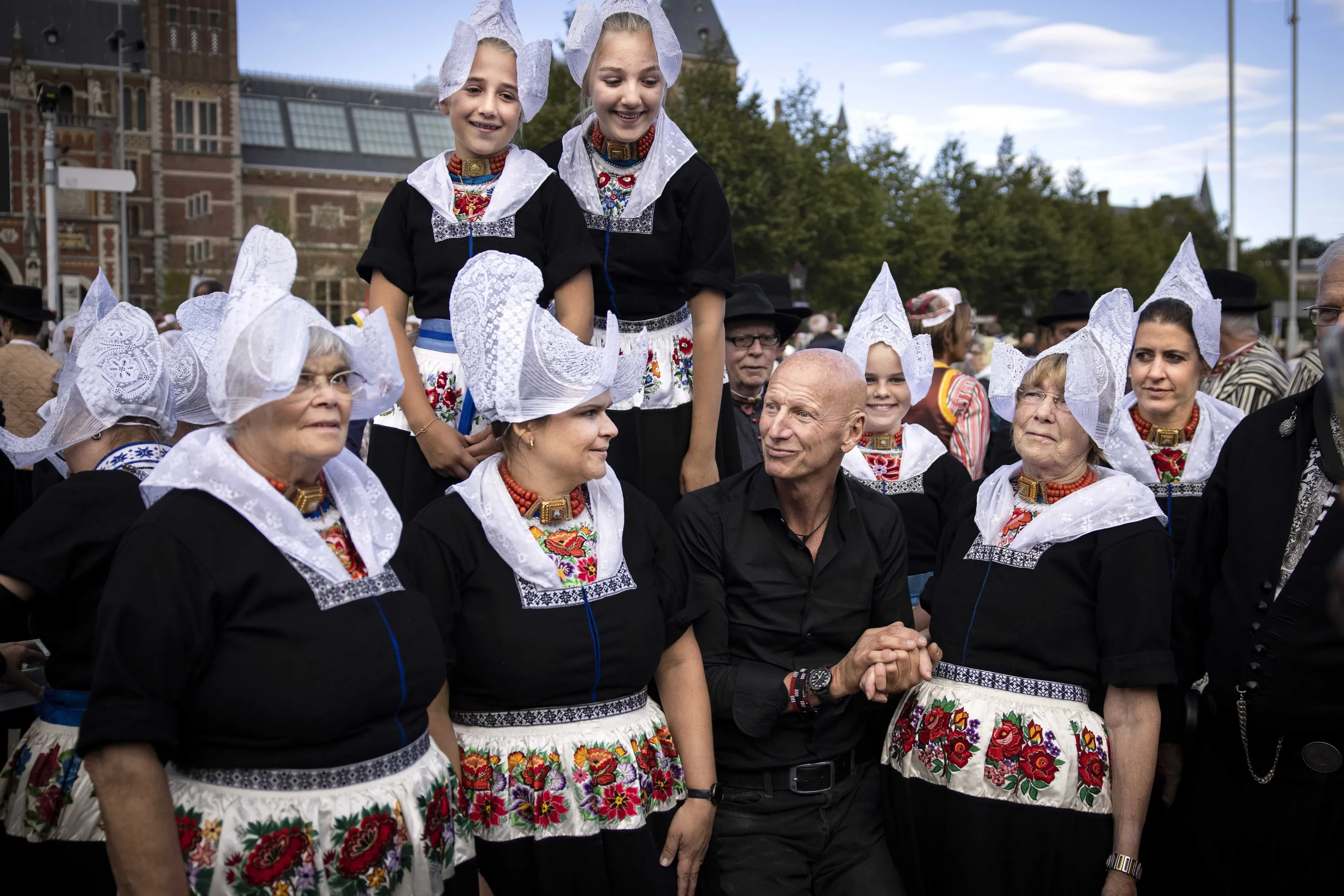 People in Dutch costumes gather during a meeting for a group portrait by photographer Jimmy Nelson on the Museumplein in Amsterdam, the Netherlands, 17 September 2022. (Photo by Ramon van Flymen/EPA/EFE)