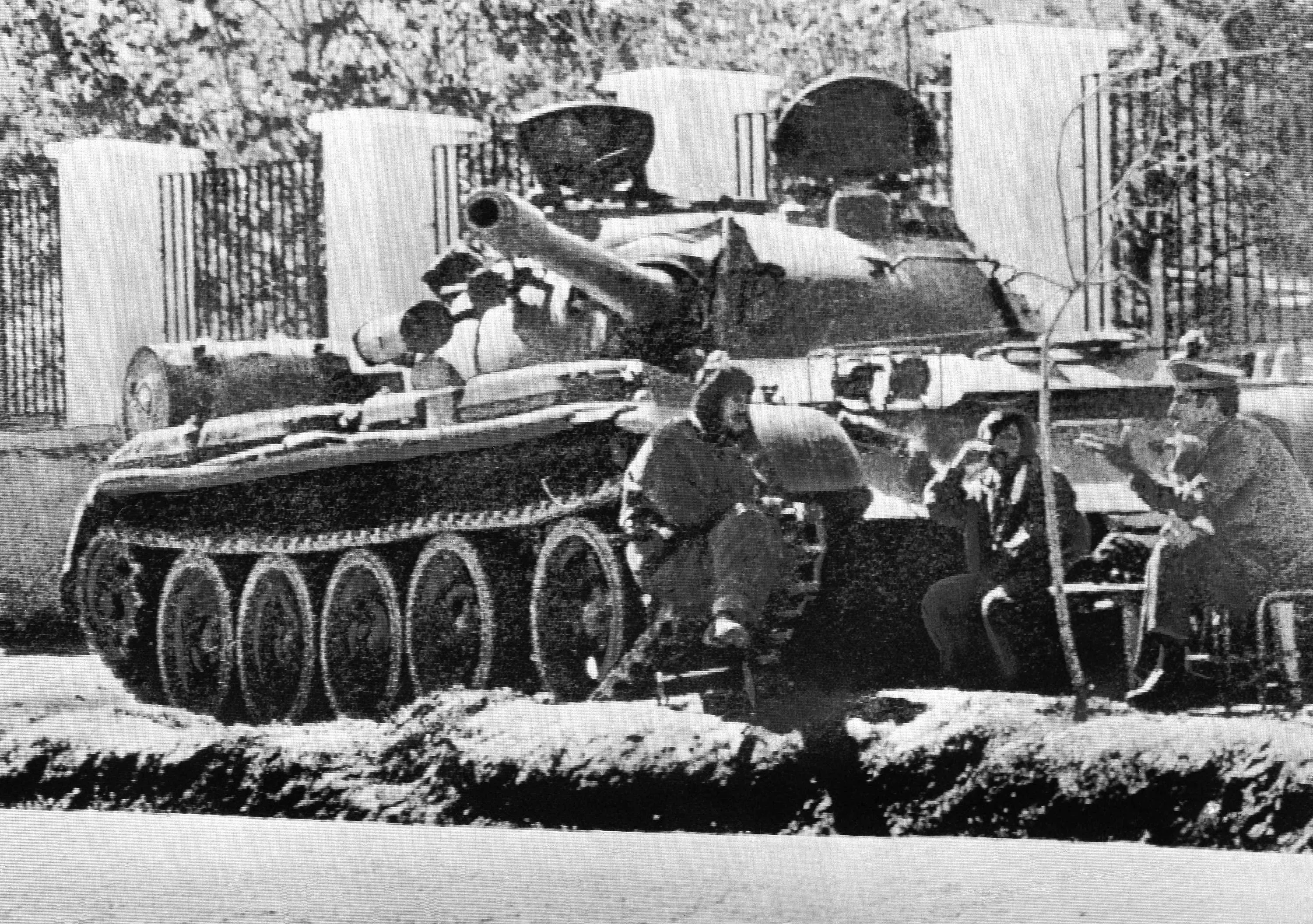 Tank crewmen bask in the sunshine beside their Soviet-made tank after taking station outside the Soviet Embassy in Kabul, Afghanistan, May 3, 1978. The former Soviet Union marched into Afghanistan on Christmas Eve, 1979, claiming it was invited by the new Afghan communist leader, Babrak Karmal, setting the country on a path of 40 years of seemingly endless wars and conflict. After the Soviets left in humiliation, America was the next great power to wade in. (Photo by AP Photo, File)