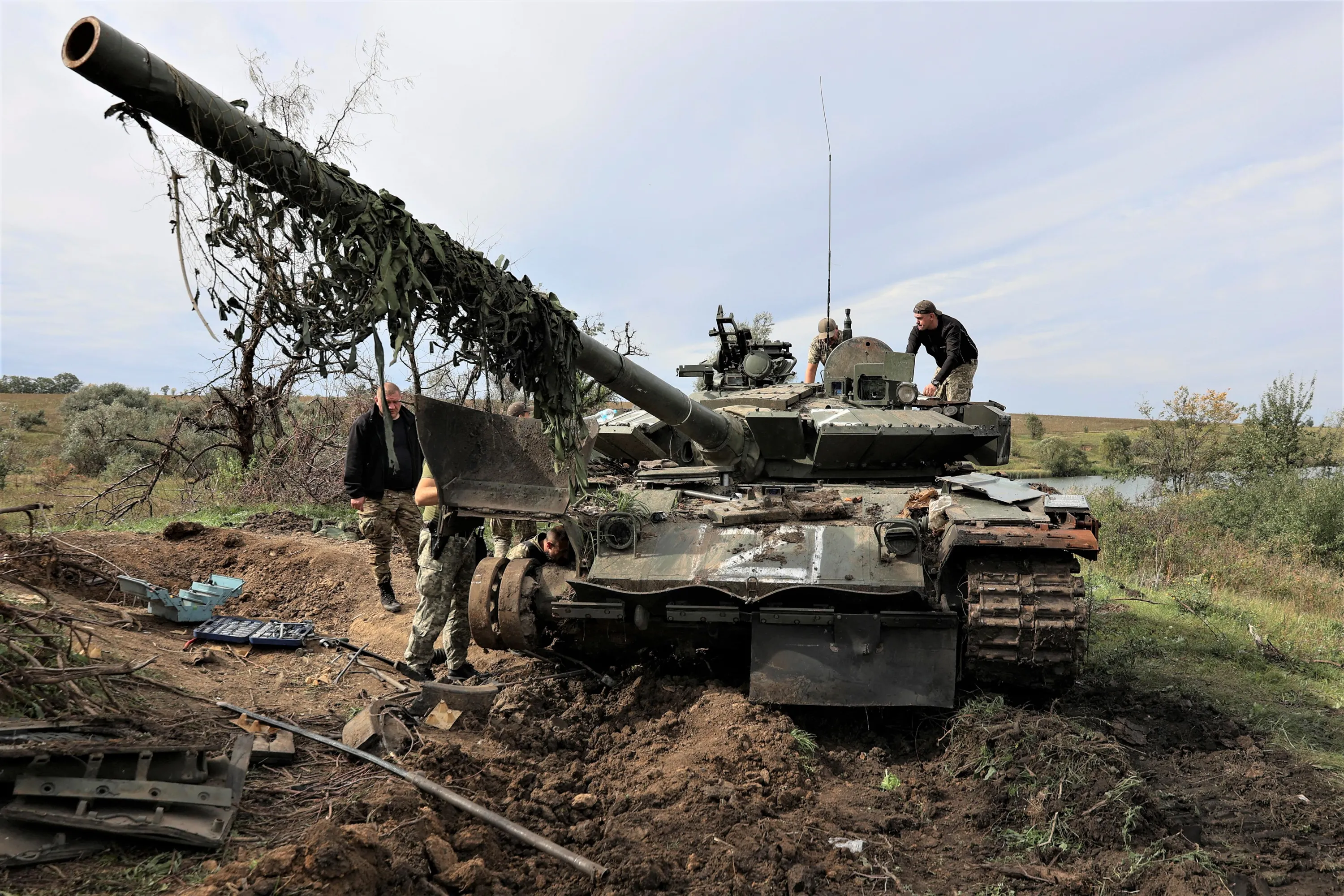 Ukrainian servicemen repair a Russian tank captured during a counteroffensive operation, amid Russia's attack on Ukraine, near the Russian border in Kharkiv region, Ukraine on September 20, 2022. (Photo by Sofiia Gatilova/Reuters)