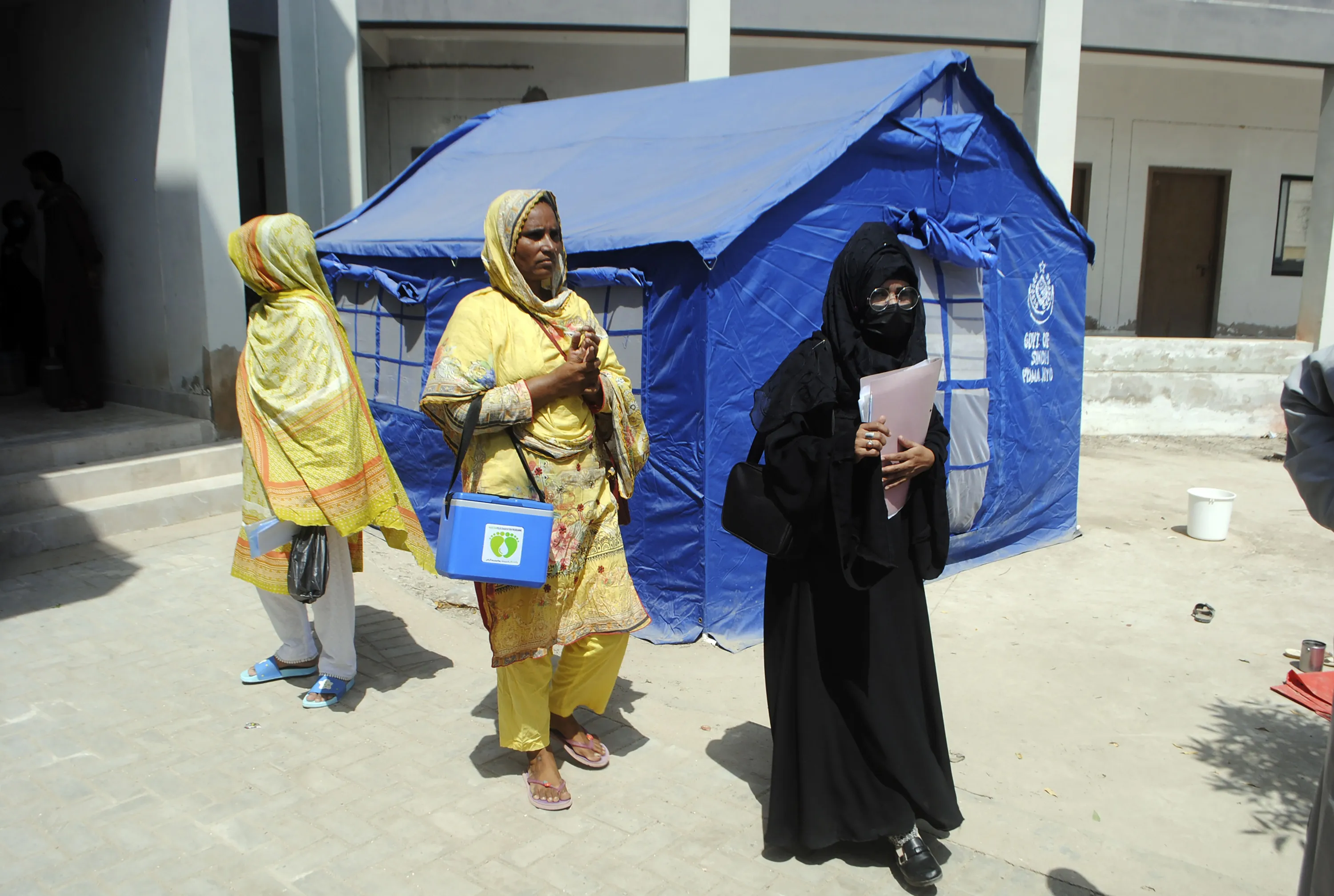 Health workers go door to door dispensing vaccinations for flood victims from monsoon rains at a camp in Hyderabad, Pakistan, Tuesday, September 6, 2022. In flood-stricken Pakistan where an unprecedented monsoon season has already killed hundreds of people, the rains are now threatening an ancient archeological site dating back 4,500 years, the site's chief official said Tuesday. (Photo by Pervez Masih/AP Photo)