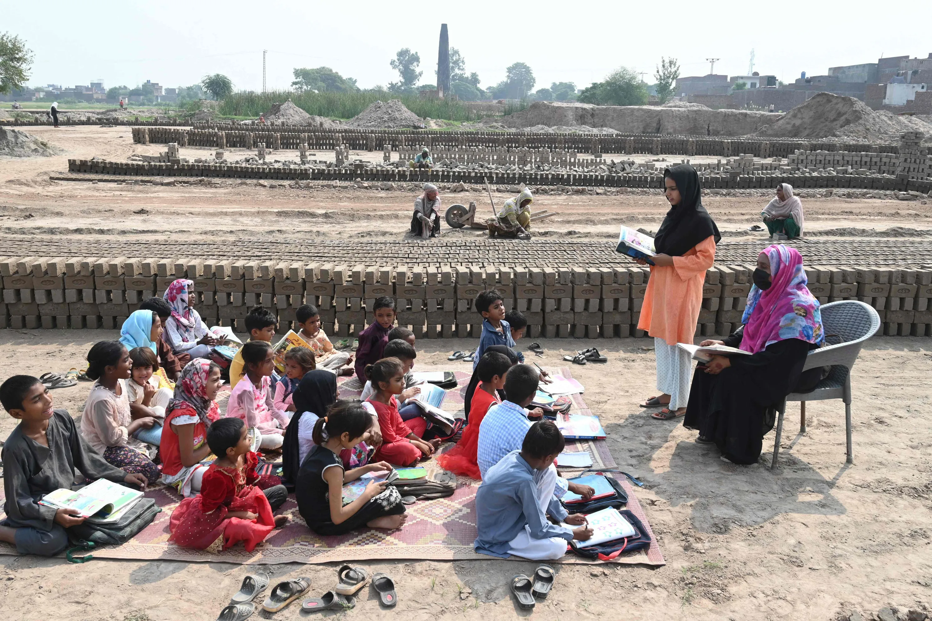 Children of brick kiln workers attend a class at a brick kiln site in Lahore on September 8, 2022. (Photo by Arif Ali/AFP Photo)