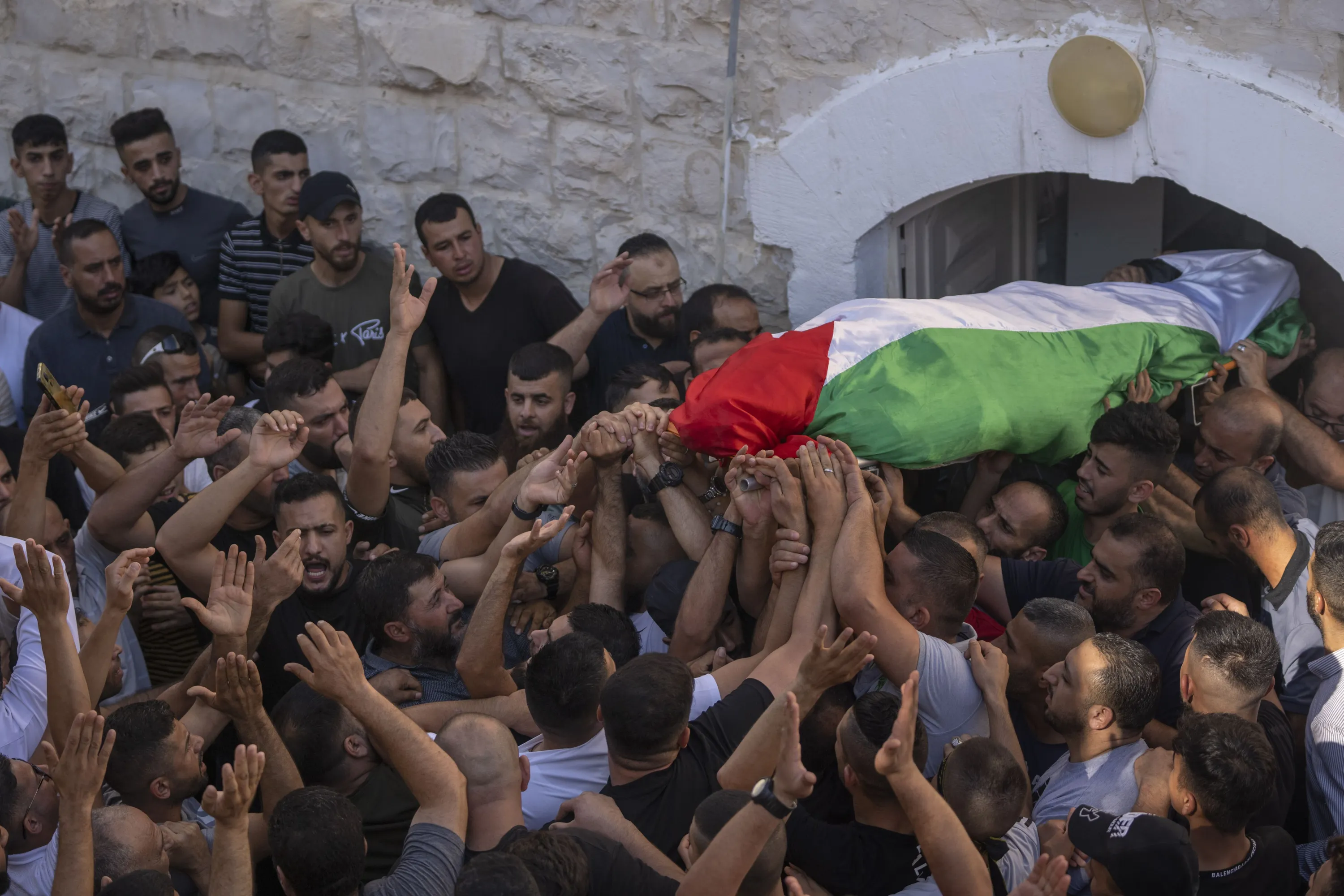 Mourners carry the body of Salah Sawafta, 58 during his funeral in the West Bank city of Tubas, Friday, August 19, 2022. Israeli forces shot and killed Sawafta during an arrest raid in the occupied West Bank on Friday, according to his brother, who said he was walking home when a bullet struck him in the head as Israeli forces clashed with Palestinian youths. (Photo by Nasser Nasser/AP Photo)