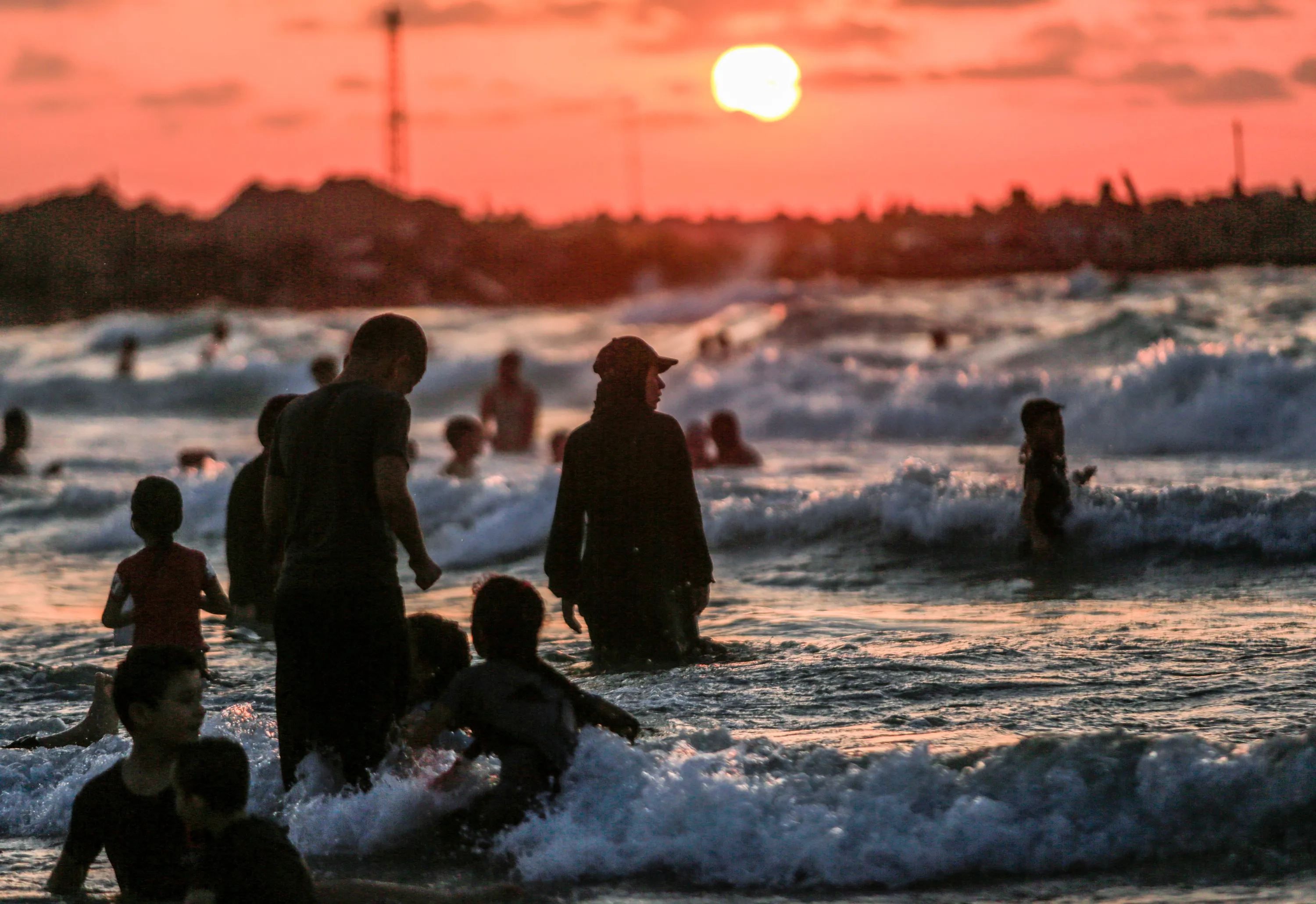 Palestinians enjoy the beach waters during a hot weather day in Gaza City on August 27, 2022. (Photo by Mahmoud Issa/SOPA Images/LightRocket via Getty Images)