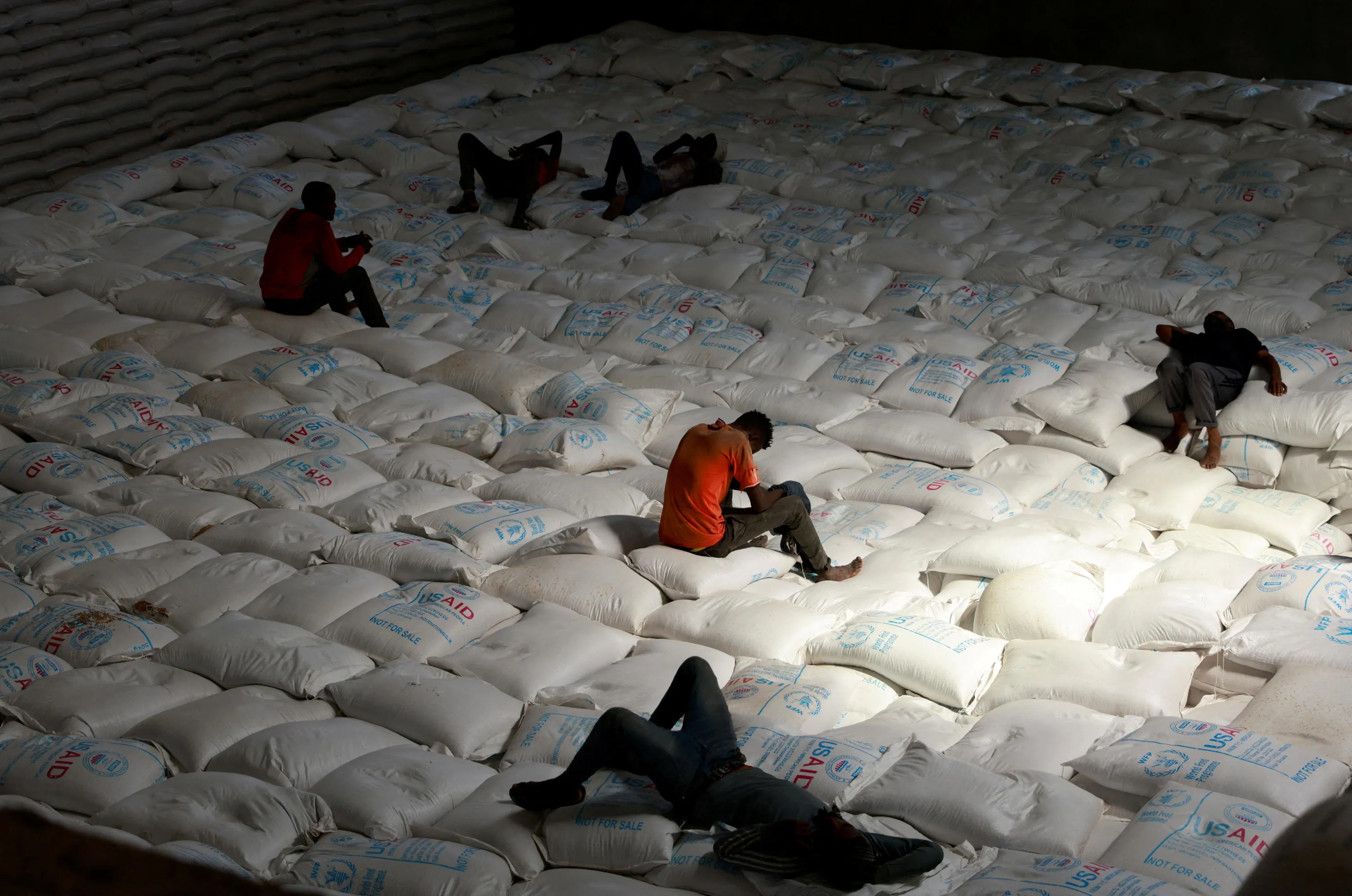 Labourers rest as they offload bags of grains as part of relief food that was sent from Ukraine at the World Food Program (WFP) warehouse in Adama town, Ethiopia om September 8, 2022. (Photo by Tiksa Negeri/Reuters)