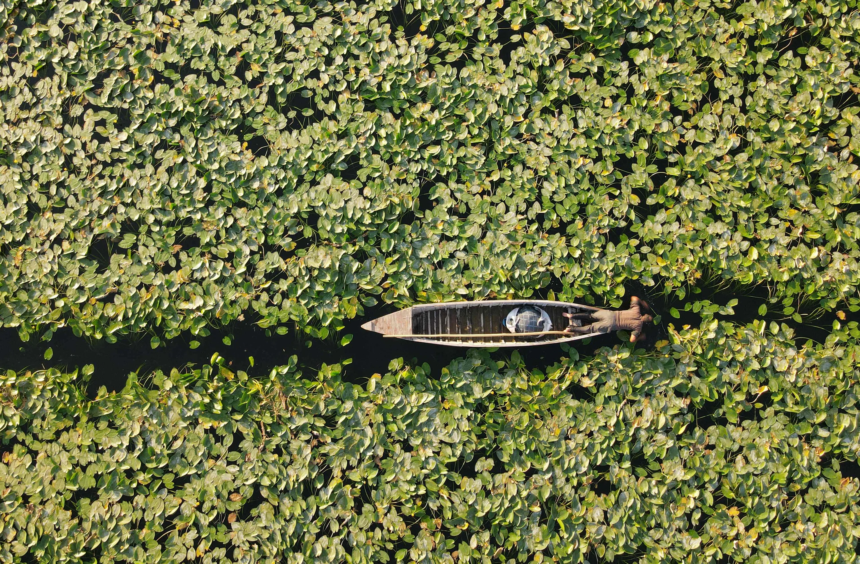 Tjis aerial view shows a fisherman rowing his boat among water lilies in Lake Golbasi in southern Turkey's Hatay province, on August 17, 2022. (Photo by Omar Haj Kadour/AFP Photo)