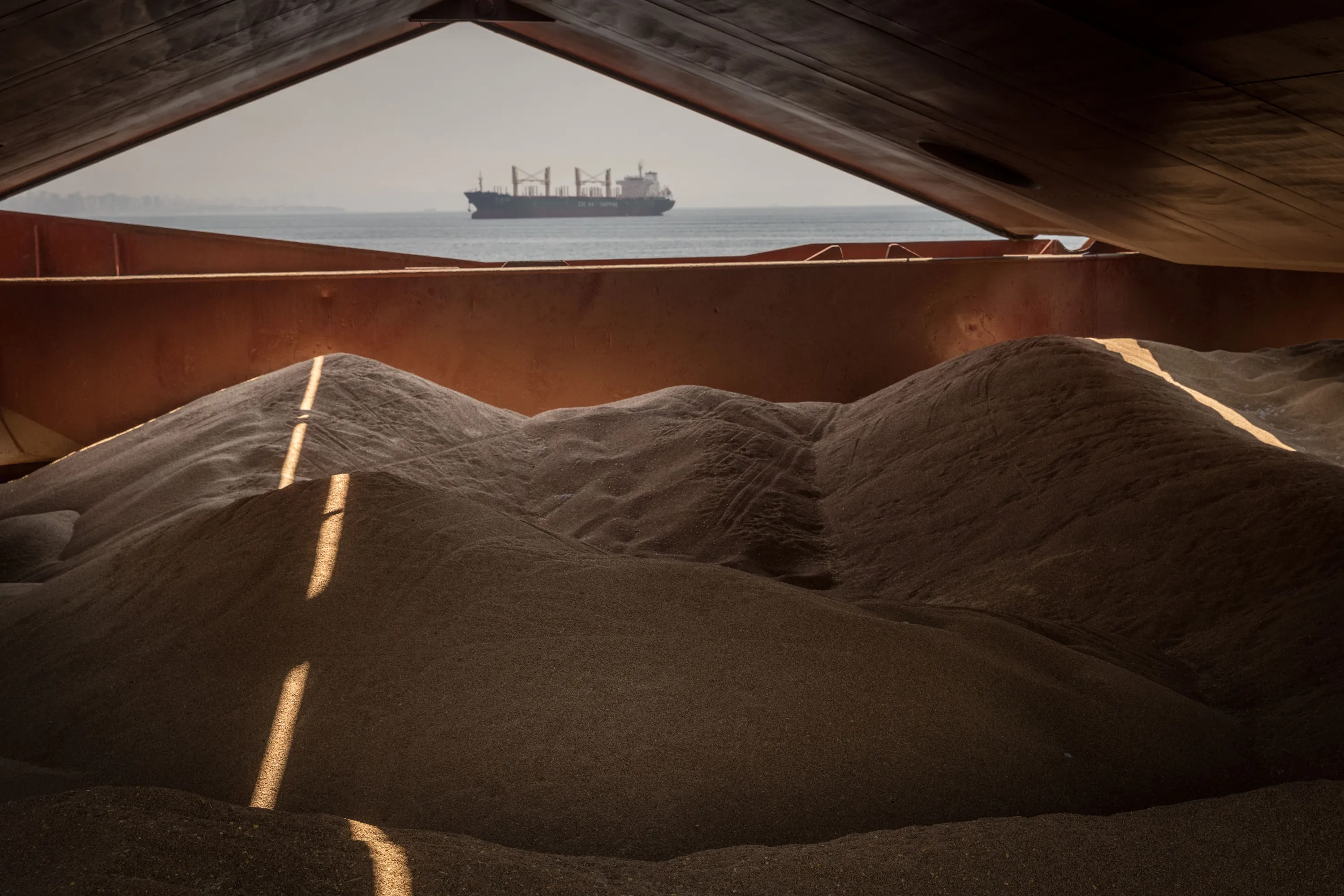 Piles of grain are seen on board the Osprey S vessel anchored in the Marmara sea during an inspection by representatives working with the joint inspection team on August 18, 2022 in Istanbul, Turkey. The Osprey S left the Ukrainian port of Chornomorsk on the 16th of August carrying 11,500 tons of grain destined for Turkey. Under the terms of last month's Black Sea Grain Initiative, which paved the way for Ukraine to safely ship grain from three key ports, vessels must be inspected by a team of officials from Turkey, Ukraine, Russia and the United Nations. (Photo by Chris McGrath/Getty Images)