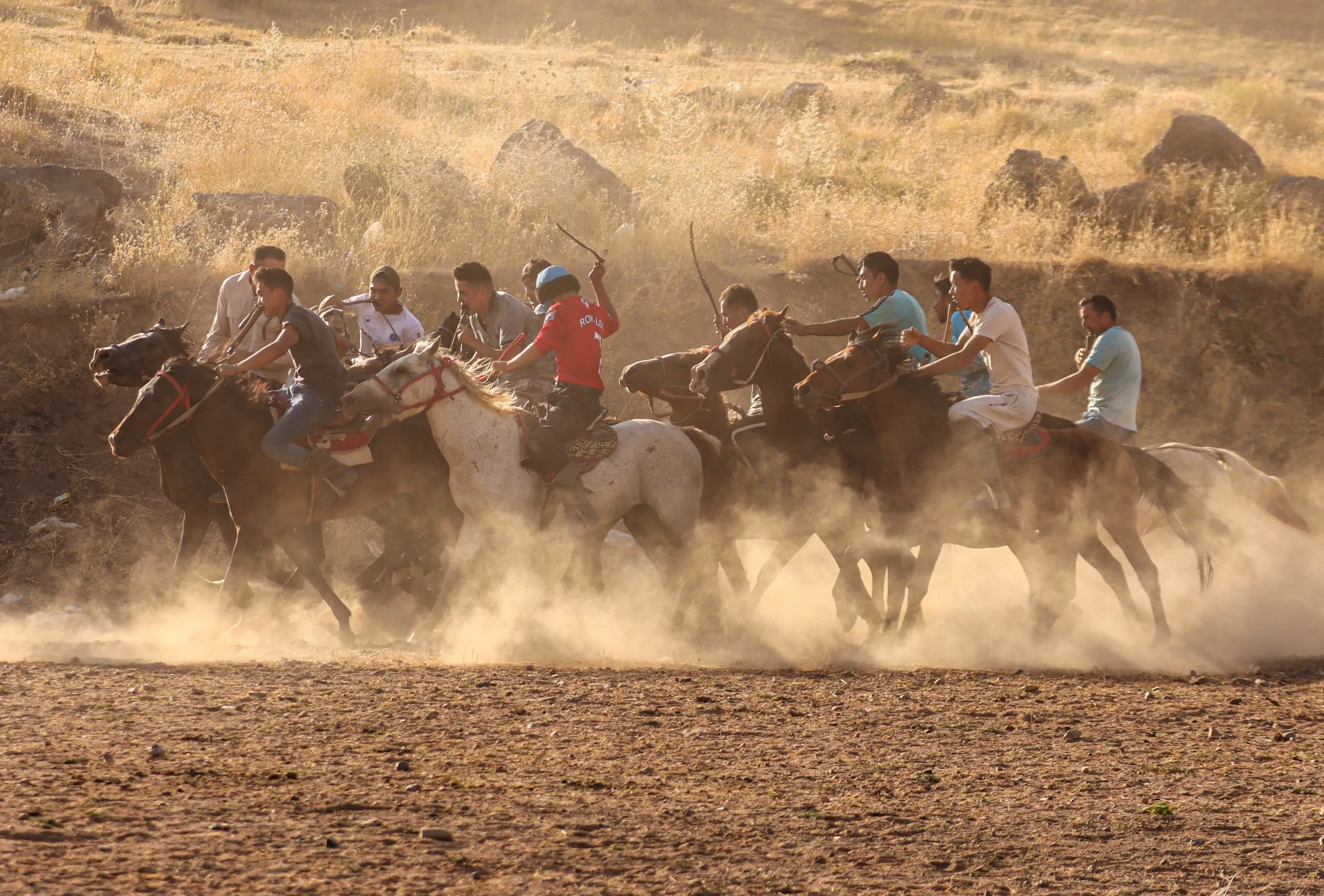 Horses and riders are seen performing the Buzkashi game, a traditional Central Asian sport formerly played by horse-mounted fighters, during the Kyrgyzstan's independence day celebrations, in Ercis district, Van, Turkiye on September 03, 2022. (Photo by Necmettin Karaca/Anadolu Agency via Getty Images)