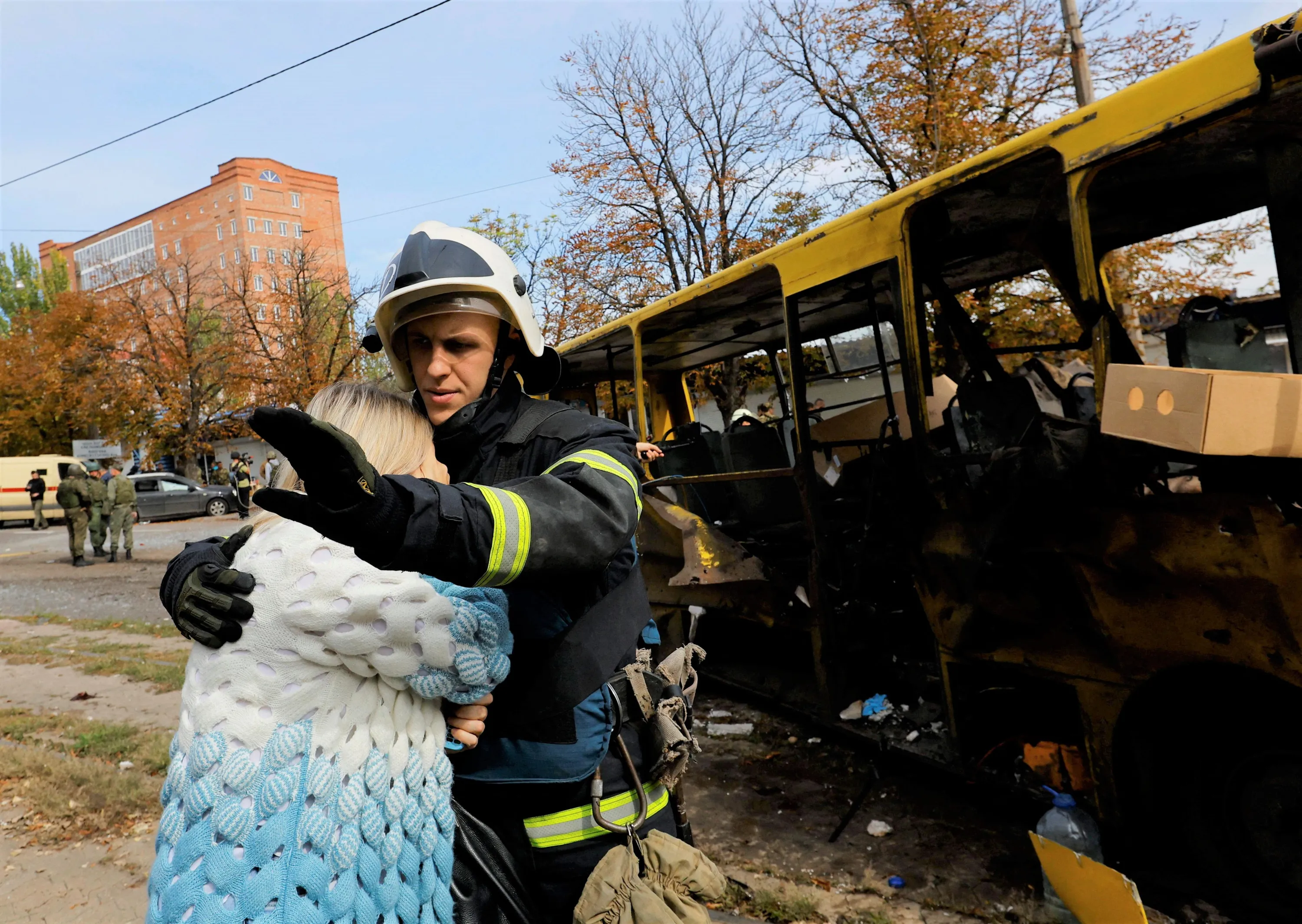 A firefighter comforts a woman next to the destroyed bus in which her teenage child was killed by shelling near a local market during Russia-Ukraine conflict in Donetsk, Ukraine on September 22, 2022. (Photo by Alexander Ermochenko/Reuters)