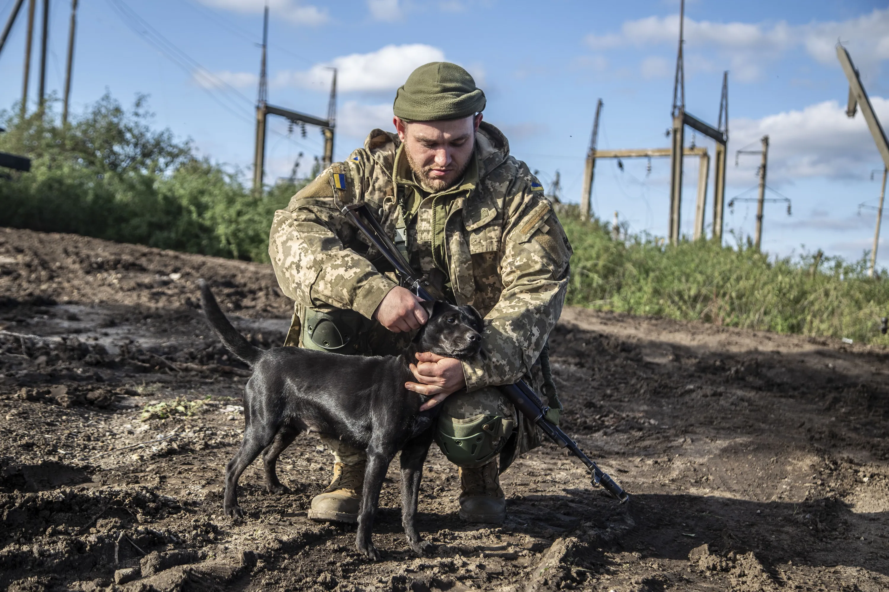 A Ukrainian soldier pets a dog in the recently retaken area close to Izium, Ukraine, Wednesday, September 21, 2022. (Photo by Oleksandr Ratushniak/AP Photo)
