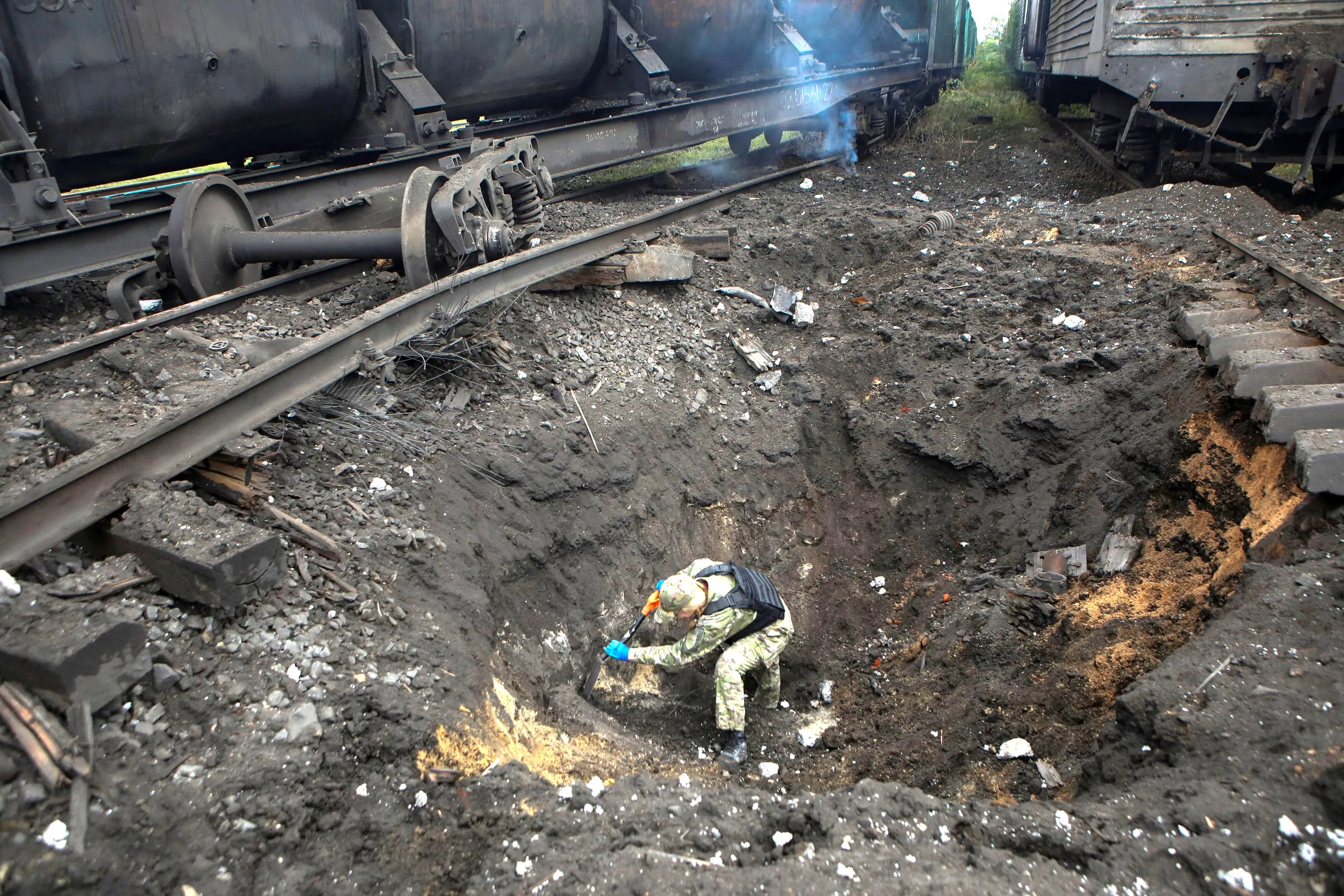 A sapper inspects a crater left by a Russian missile strike at a railway cargo terminal in Kharkiv, Ukraine on September 21, 2022. (Photo by Reuters/Stringer)