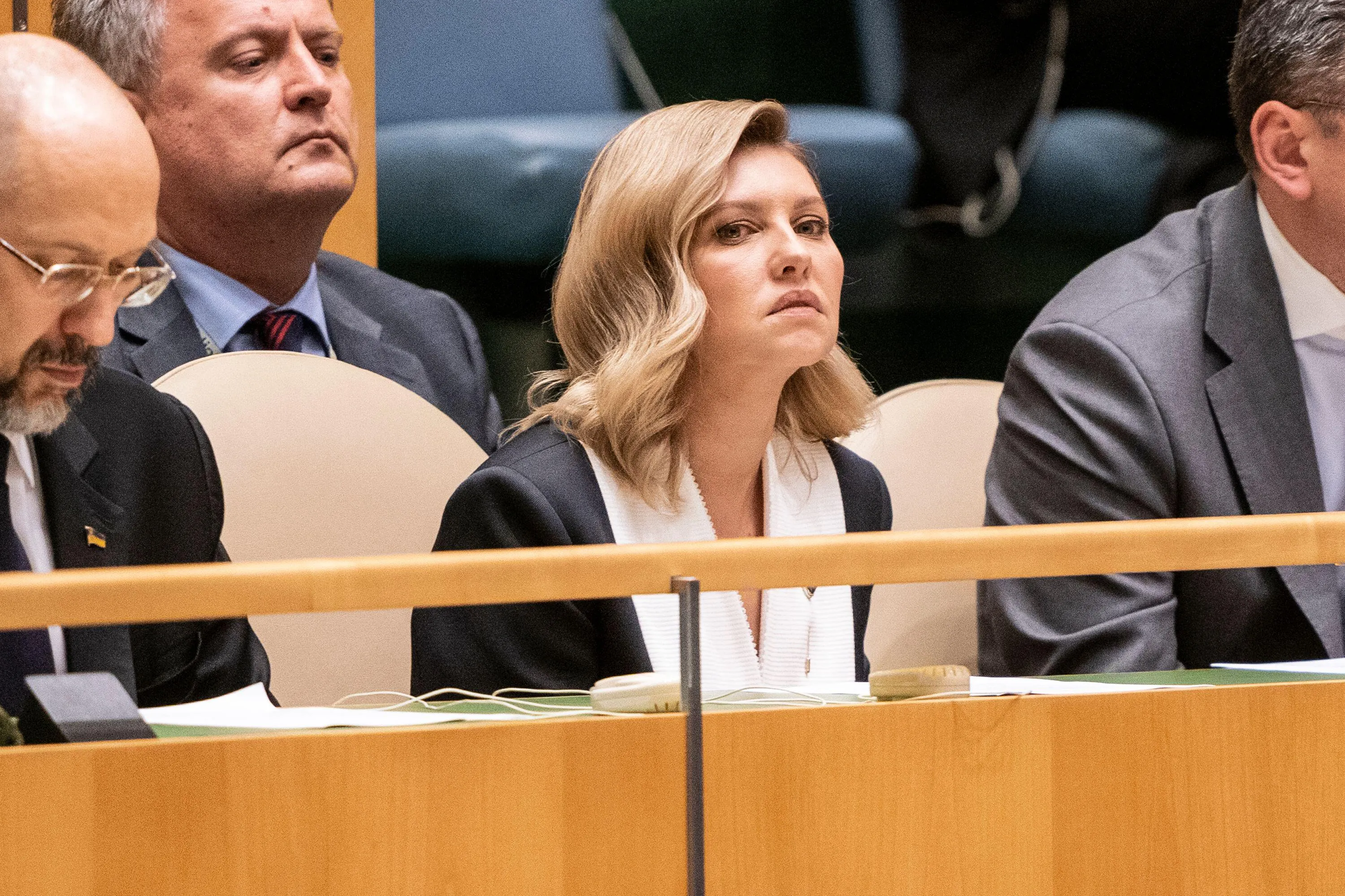 First Lady of Ukraine Olena Zelenska (C) attends 77th General Assembly of the United Nations as President of Ukraine Volodymyr Zelenskyy deliver pre-recorded address at UN Headquarters on September 21, 2022 in New York. (Photo by Lev Radin/Pacific Press via ZUMA Press Wire/Alamy Live News)